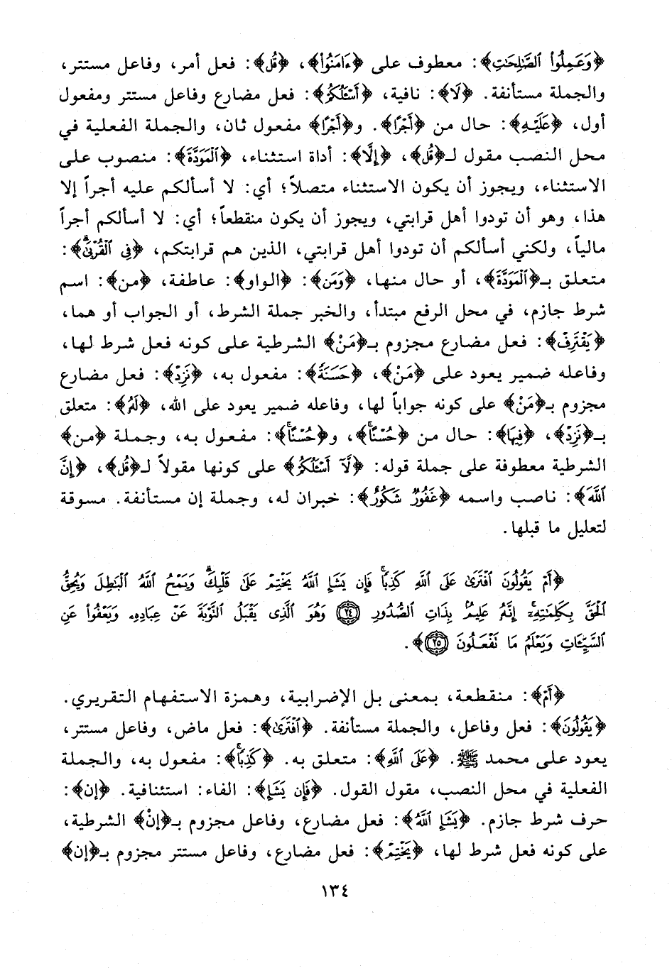 {وَعَمِلُوا الصَّالِحَاتِ}: معطوف على {آمَنُوا}، {قُلْ}: فعل أمر، وفاعل مستتر، والجملة مستأنفة. {لَا}: نافية، {أَسْأَلُكُمْ}: فعل مضارع وفاعل مستتر ومفعول أول، {عَلَيْهِ}: حال من {أَجْرًا}. و {أَجْرًا} مفعول ثان، والجملة الفعلية في محل النصب مقول لـ {قُلْ}، {إِلَّا}: أداة استثناء، {الْمَوَدَّةَ}: منصوب على الاستثناء، ويجوز أن يكون الاستثناء متصلًا؛ أي: لا أسألكم عليه أجرًا إلا هذا، وهو أن تودوا أهل قرابتي، ويجوز أن يكون منقطعًا؛ أي: لا أسألكم أجرًا ماليًا، ولكني أسألكم أن تودوا أهل قرابتي، الذين هم قرابتكم، {فِي الْقُرْبَى}: متعلق بـ {الْمَوَدَّةَ}، أو حال منها، {وَمَنْ}: {الواو}: عاطفة، {مَنْ}: اسم شرط جازم، في محل الرفع مبتدأ، والخبر جملة الشرط، أو الجواب أو هما، {يَقْتَرِفْ}: فعل مضارع مجزوم بـ {مَنْ} الشرطية على كونه فعل شرط لها، وفاعله ضمير يعود على {مَنْ}، {حَسَنَةً}: مفعول به، {نَزِدْ}: فعل مضارع مجزوم بـ {مَنْ} على كونه جوابًا لها، وفاعله ضمير يعود على الله، {لَهُ}: متعلق بـ {نَزِدْ}، {فِيهَا}: حال من {حُسْنًا}، و {حُسْنًا}: مفعول به، وجملة {مَنْ} الشرطية معطوفة على جملة قوله: {لَا أَسْأَلُكُمْ} على كونها مقولًا لـ {قُلْ}، {إِنَّ اللَّهَ}: ناصب واسمه {غَفُورٌ شَكُورٌ}: خبران له، وجملة إن مستأنفة. مسوقة لتعليل ما قبلها.
