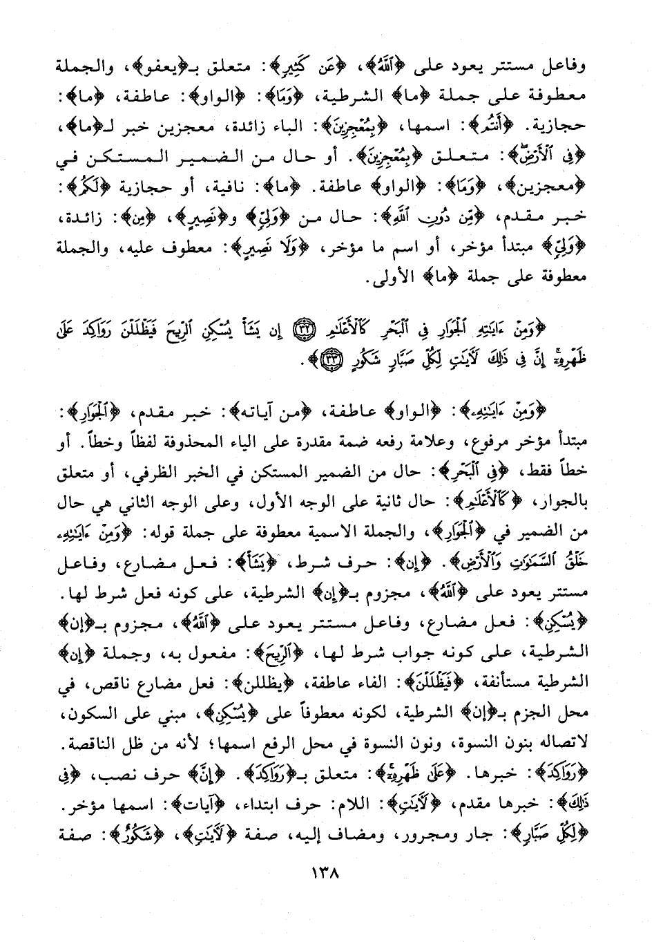 {وَمِنْ آيَاتِهِ}: {الواو} عاطفة، {مِنْ آيَاتِهِ}: خبر مقدم، {الْجَوَارِ}: مبتدأ مؤخر مرفوع، وعلامة رفعه ضمة مقدرة على الياء المحذوفة لفظًا وخطًا. أو خطًا فقط، {فِي الْبَحْرِ}: حال من الضمير المستكن في الخبر الظرفي، أو متعلق بالجوار، {كَالْأَعْلَامِ}: حال ثانية على الوجه الأول، وعلى الوجه الثاني هي حال من الضمير في {الْجَوَارِ}، والجملة الاسمية معطوفة على جملة قوله: {وَمِنْ آيَاتِهِ خَلْقُ السَّمَاوَاتِ وَالْأَرْضِ}. {إِنْ}: حرف شرط، {يَشَأْ}: فعل مضارع، وفاعل مستتر يعود على {الله}، مجزوم بـ {إِنْ} الشرطية، على كونه فعل شرط لها. {يُسْكِنِ}: فعل مضارع، وفاعل مستتر يعود على {الله}، مجزوم بـ {إِنْ} الشرطية، على كونه جواب شرط لها، {الرِّيحَ}: مفعول به، وجملة {إِنْ} الشرطية مستأنفة، {فَيَظْلَلْنَ}: الفاء عاطفة، {يَظْلَلْنَ}: فعل مضارع ناقص، في محل الجزم بـ {إِنْ} الشرطية، لكونه معطوفًا على {يُسْكِنِ}، مبني على السكون، لاتصاله بنون النسوة، ونون النسوة في محل الرفع اسمها؛ لأنه من ظل الناقصة. {رَوَاكِدَ}: خبرها. {عَلَى ظَهْرِهِ}: متعلق بـ {رَوَاكِدَ}. {إِنَّ} حرف نصب، {فِي ذَلِكَ}: خبرها مقدم، {لَآيَاتٍ}: اللام: حرف ابتداء، {آيَاتٍ}: اسمها مؤخر. {لِكُلِّ صَبَّارٍ}: جار ومجرور، ومضاف إليه، صفة {لَآيَاتٍ}، {شَكُورٍ}: صفة