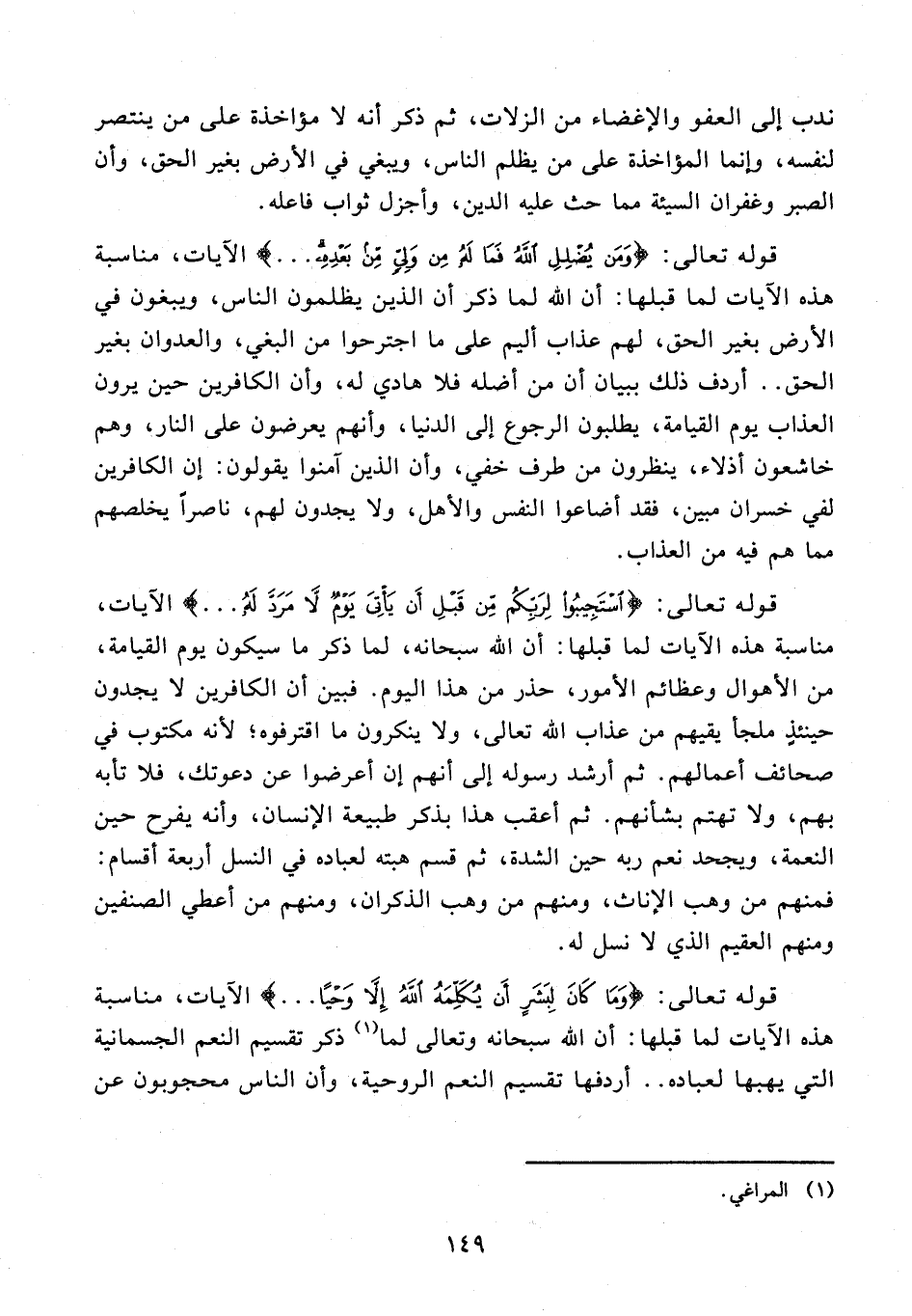 قوله تعالى: {وَمَا كَانَ لِبَشَرٍ أَنْ يُكَلِّمَهُ اللَّهُ إِلَّا وَحْيًا ...} الآيات، مناسبة هذه الآيات لما قبلها: أن الله سبحانه وتعالى لما (¬1) ذكر تقسيم النعم الجسمانية التي يهبها لعباده .. أردفها تقسيم النعم الروحية، وأن الناس محجوبون عن