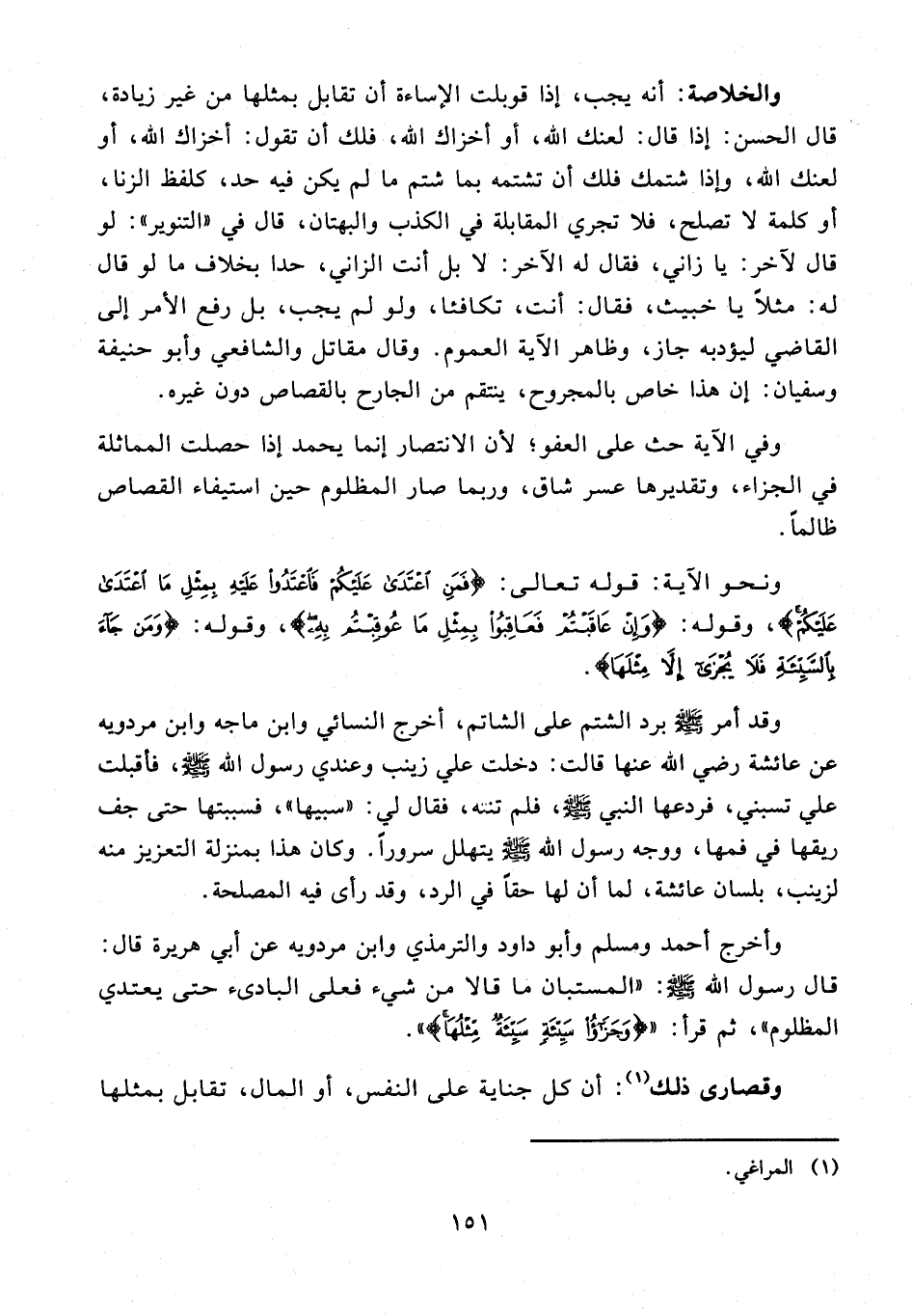 والخلاصة: أنه يجب، إذا قوبلت الإساءة أن تقابل بمثلها من غير زيادة، قال الحسن: إذا قال: لعنك الله، أو أخزاك الله، ذلك أن تقول: أخزاك الله، أو لعنك الله، وإذا شتمك فلك أن تشتمه بما شتم ما لم يكن فيه حد، كلفظ الزنا، أو كلمة لا تصلح، فلا تجري المقابلة في الكذب والبهتان، قال في "التنوير": لو قال لآخر: يا زاني، فقال له الآخر: لا بل أنت الزاني، حدا بخلاف ما لو قال له: مثلًا يا خبيث، فقال: أنت، تكافئا, ولو لم يجب، بل رفع الأمر إلى القاضي ليؤدبه جاز، وظاهر الآية العموم. وقال مقاتل والشافعي وأبو حنيفة وسفيان: إن هذا خاص بالمجروح، ينتقم من الجارح بالقصاص دون غيره.