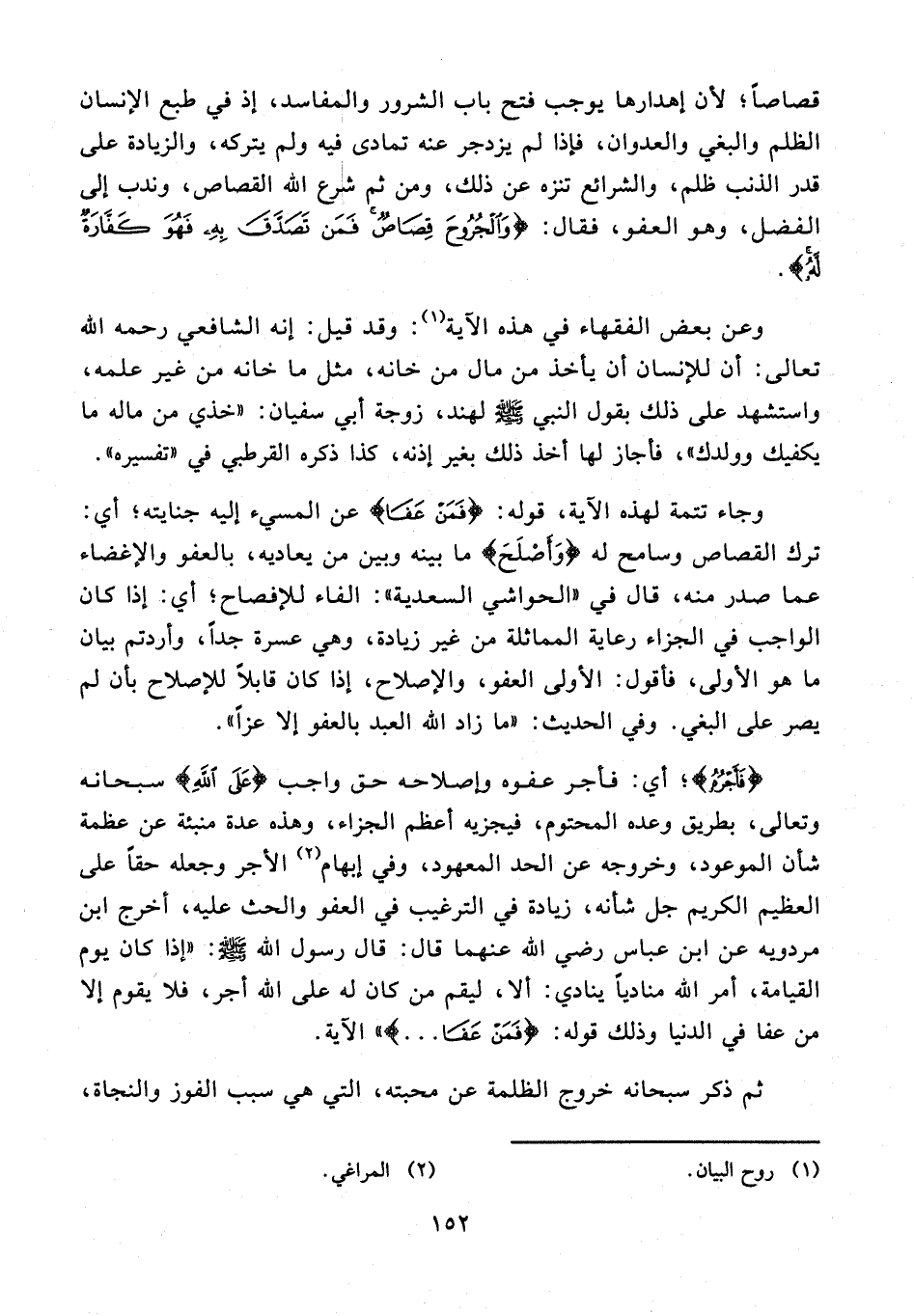 وجاء تتمة لهذه الآية، قوله: {فَمَنْ عَفَا} عن المسيء إليه جنايته؛ أي: ترك القصاص وسامح له {وَأَصْلَحَ} ما بينه وبين من يعاديه، بالعفو والإغضاء عما صدر منه، قال في "الحواشي السعدية": الفاء للإفصاح؛ أي: إذا كان الواجب في الجزاء رعاية المماثلة من غير زيادة، وهي عسرة جدًّا، وأردتم بيان ما هو الأولى، فأقول: الأولى العفو، والإصلاح، إذا كان قابلًا للإصلاح بأن لم يصر على البغي. وفي الحديث: "ما زاد الله العبد بالعفو إلا عزًا".
