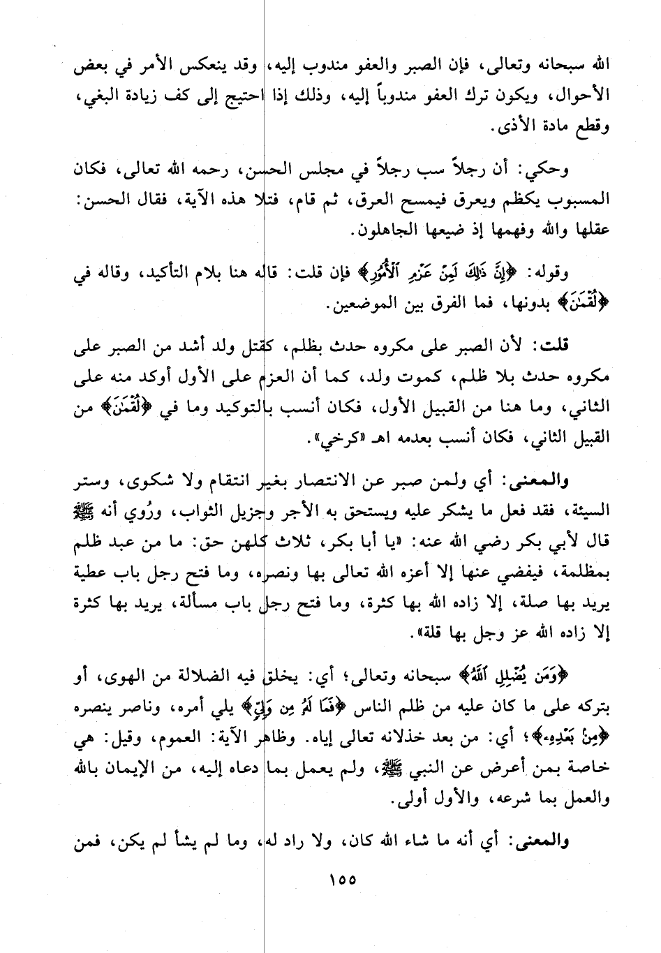 والمعنى: أي ولمن صبر عن الانتصار بغير انتقام ولا شكوى، وستر السيئة، فقد فعل ما يشكر عليه ويستحق به الأجر وجزيل الثواب، ورُوي أنه - صلى الله عليه وسلم - قال لأبي بكر رضي الله عنه: "يا أبا بكر، ثلاث كلهن حق: ما من عبد ظلم بمظلمة، فيفضي عنها إلا أعزه الله تعالى بها ونصره، وما فتح رجل باب عطية يريد بها صلة، إلا زاده الله بها كثرة، وما فتح رجل باب مسألة، يريد بها كثرة إلا زاده الله عَزَّ وَجَلَّ بها قلة".