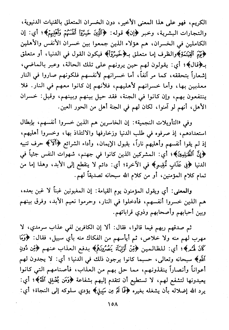 الكريم، فهو على هذا المعنى الأخير، دون الخسران المتعلق بالقنيات الدنيوية، والتجارات البشرية، وخبر {إن} قوله: {الَّذِينَ خَسِرُوا أَنْفُسَهُمْ وَأَهْلِيهِمْ}؛ أي: إن الكاملين في الخسران، هم هؤلاء الذين جمعوا بين خسران الأنفس والأهلين {يَوْمَ الْقِيَامَةِ} والظرف إما متعلق بـ {خَسِرُوا} فيكون القول في الدنيا، أو متعلق بـ {قَالَ}؛ أي: يقولون لهم حين يرونهم على تلك الحالة، وعبر بالماضي، إشعارًا بتحققه، كما مر آنفًا، أما خسرانهم لأنفسهم فلكونهم صاروا في النار معذبين بها، وأما خسرانهم لأهليهم، فلأنهم إن كانوا معهم في النار. فلا ينتفعون بهم، وإن كانوا في الجنة، فقد حيل بينهم وبينهم، وقيل: خسران الأهل، أنهم لو آمنوا، لكان لهم في الجنة أهل من الحور العين.
