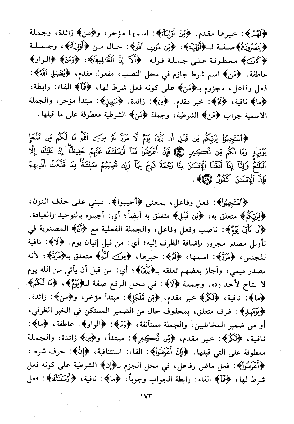 {اسْتَجِيبُوا}: فعل وفاعل، بمعنى {أجيبوا}. مبني على حذف النون، {لِرَبِّكُمْ} متعلق به، {مِنْ قَبْلِ} متعلق به أيضًا؛ أي: أجيبوه بالتوحيد والعبادة. {أَنْ يَأْتِيَ يَوْمٌ}: ناصب وفعل وفاعل، والجملة الفعلية مع {أَنْ} المصدرية في تأويل مصدر مجرور بإضافة الظرف إليه؛ أي: من قبل إتيان يوم. {لَا}: نافية للجنس، {مَرَدّ}: اسمها، {لَهُ}: خبرها، {مِنَ اللَّهِ} متعلق بـ {مَرَدَّ}؛ لأنه مصدر ميمي، وأجاز بعضهم تعلقه بـ {يَأْتِيَ}؛ أي: من قبل أن يأتي من الله يوم لا يتاح لأحد رده. وجملة {لَا}: في محل الرفع صفة لـ {يَوْمٌ}، {مَا لَكُمْ} {ما}: نافية، {لَكُمْ} خبر مقدم، {مِنْ مَلْجَإٍ}: مبتدأ مؤخر، و {من}: زائدة. {يَوْمَئِذٍ}: ظرف متعلق، بمحذوف حال من الضمير المستكن في الخبر الظرفي، أو من ضمير المخاطبين، والجملة مستأنفة، {وَمَا}: {الواو}: عاطفة، {ما}: نافية، {لَكُمْ}: خبر مقدم، {مِنْ نَكِيرٍ}: مبتدأ، و {مِن} زائدة، والجملة معطوفة على التي قبلها. {فَإِنْ أَعْرَضُوا}: الفاء: استئنافية، {إِنْ}: حرف شرط، {أَعْرَضُوا}: فعل ماض وفاعل، في محل الجزم بـ {إن} الشرطية على كونه فعل شرط لها، {فَمَا} الفاء: رابطة الجواب وجوبًا، {ما}: نافية، {أَرْسَلْنَاكَ}: فعل