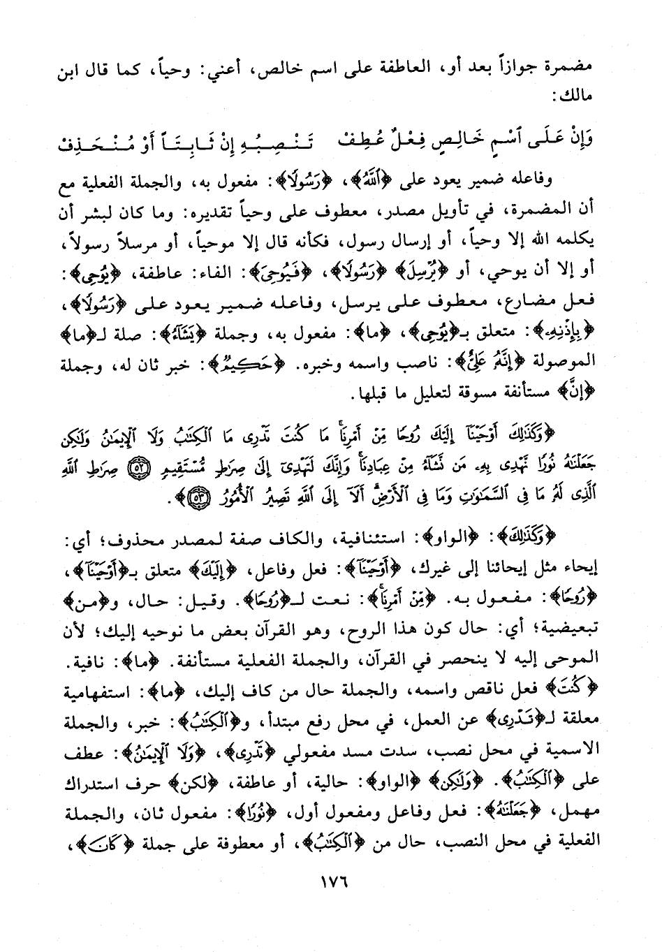{وَكَذَلِكَ}: {الواو}: استئنافية، والكاف صفة لمصدر محذوف؛ أي: إيحاء مثل إيحائنا إلى غيرك، {أَوْحَيْنَا}: فعل وفاعل، {إِلَيْكَ} متعلق بـ {أَوْحَيْنَا}، {رُوحًا}: مفعول به. {مِنْ أَمْرِنَا}: نعت لـ {رُوحًا}. وقيل: حال، و {مِنْ} تبعيضية؛ أي: حال كون هذا الروح، وهو القرآن بعض ما نوحيه إليك؛ لأن الموحى إليه لا ينحصر في القرآن، والجملة الفعلية مستأنفة. {ما}: نافية. {كُنْتَ} فعل ناقص واسمه، والجملة حال من كاف إليك، {ما}: استفهامية معلقة لـ {تَدْرِي} عن العمل، في محل رفع مبتدأ، و {الْكِتَابُ}: خبر، والجملة الاسمية في محل نصب، سدت مسد مفعولي {تَدْرِي}، {وَلَا الْإِيمَانُ}: عطف على {الْكِتَابُ}. {وَلَكِنْ} {الواو}: حالية، أو عاطفة، {لَكِنْ} حرف استدراك مهمل، {جَعَلْنَاهُ}: فعل وفاعل ومفعول أول، {نُورًا}: مفعول ثان، والجملة الفعلية في محل النصب، حال من {الْكِتَابُ}، أو معطوفة على جملة {كَانَ}،
