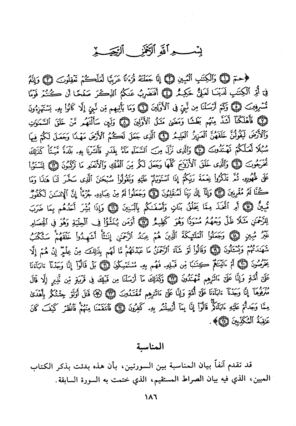 {حم (1) وَالْكِتَابِ الْمُبِينِ (2) إِنَّا جَعَلْنَاهُ قُرْآنًا عَرَبِيًّا لَعَلَّكُمْ تَعْقِلُونَ (3) وَإِنَّهُ فِي أُمِّ الْكِتَابِ لَدَيْنَا لَعَلِيٌّ حَكِيمٌ (4) أَفَنَضْرِبُ عَنْكُمُ الذِّكْرَ صَفْحًا أَنْ كُنْتُمْ قَوْمًا مُسْرِفِينَ (5) وَكَمْ أَرْسَلْنَا مِنْ نَبِيٍّ فِي الْأَوَّلِينَ (6) وَمَا يَأْتِيهِمْ مِنْ نَبِيٍّ إِلَّا كَانُوا بِهِ يَسْتَهْزِئُونَ (7) فَأَهْلَكْنَا أَشَدَّ مِنْهُمْ بَطْشًا وَمَضَى مَثَلُ الْأَوَّلِينَ (8) وَلَئِنْ سَأَلْتَهُمْ مَنْ خَلَقَ السَّمَاوَاتِ وَالْأَرْضَ لَيَقُولُنَّ خَلَقَهُنَّ الْعَزِيزُ الْعَلِيمُ (9) الَّذِي جَعَلَ لَكُمُ الْأَرْضَ مَهْدًا وَجَعَلَ لَكُمْ فِيهَا سُبُلًا لَعَلَّكُمْ تَهْتَدُونَ (10) وَالَّذِي نَزَّلَ مِنَ السَّمَاءِ مَاءً بِقَدَرٍ فَأَنْشَرْنَا بِهِ بَلْدَةً مَيْتًا كَذَلِكَ تُخْرَجُونَ (11) وَالَّذِي خَلَقَ الْأَزْوَاجَ كُلَّهَا وَجَعَلَ لَكُمْ مِنَ الْفُلْكِ وَالْأَنْعَامِ مَا تَرْكَبُونَ (12) لِتَسْتَوُوا عَلَى ظُهُورِهِ ثُمَّ تَذْكُرُوا نِعْمَةَ رَبِّكُمْ إِذَا اسْتَوَيْتُمْ عَلَيْهِ وَتَقُولُوا سُبْحَانَ الَّذِي سَخَّرَ لَنَا هَذَا وَمَا كُنَّا لَهُ مُقْرِنِينَ (13) وَإِنَّا إِلَى رَبِّنَا لَمُنْقَلِبُونَ (14) وَجَعَلُوا لَهُ مِنْ عِبَادِهِ جُزْءًا إِنَّ الْإِنْسَانَ لَكَفُورٌ مُبِينٌ (15) أَمِ اتَّخَذَ مِمَّا يَخْلُقُ بَنَاتٍ وَأَصْفَاكُمْ بِالْبَنِينَ (16) وَإِذَا بُشِّرَ أَحَدُهُمْ بِمَا ضَرَبَ لِلرَّحْمَنِ مَثَلًا ظَلَّ وَجْهُهُ مُسْوَدًّا وَهُوَ كَظِيمٌ (17) أَوَمَنْ يُنَشَّأُ فِي الْحِلْيَةِ وَهُوَ فِي الْخِصَامِ غَيْرُ مُبِينٍ (18) وَجَعَلُوا الْمَلَائِكَةَ الَّذِينَ هُمْ عِبَادُ الرَّحْمَنِ إِنَاثًا أَشَهِدُوا خَلْقَهُمْ سَتُكْتَبُ شَهَادَتُهُمْ وَيُسْأَلُونَ (19) وَقَالُوا لَوْ شَاءَ الرَّحْمَنُ مَا عَبَدْنَاهُمْ مَا لَهُمْ بِذَلِكَ مِنْ عِلْمٍ إِنْ هُمْ إِلَّا يَخْرُصُونَ (20) أَمْ آتَيْنَاهُمْ كِتَابًا مِنْ قَبْلِهِ فَهُمْ بِهِ مُسْتَمْسِكُونَ (21) بَلْ قَالُوا إِنَّا وَجَدْنَا آبَاءَنَا عَلَى أُمَّةٍ وَإِنَّا عَلَى آثَارِهِمْ مُهْتَدُونَ (22) وَكَذَلِكَ مَا أَرْسَلْنَا مِنْ قَبْلِكَ فِي قَرْيَةٍ مِنْ نَذِيرٍ إِلَّا قَالَ مُتْرَفُوهَا إِنَّا وَجَدْنَا آبَاءَنَا عَلَى أُمَّةٍ وَإِنَّا عَلَى آثَارِهِمْ مُقْتَدُونَ (23) قَالَ أَوَلَوْ جِئْتُكُمْ بِأَهْدَى مِمَّا وَجَدْتُمْ عَلَيْهِ آبَاءَكُمْ قَالُوا إِنَّا بِمَا أُرْسِلْتُمْ بِهِ كَافِرُونَ (24) فَانْتَقَمْنَا مِنْهُمْ فَانْظُرْ كَيْفَ كَانَ عَاقِبَةُ الْمُكَذِّبِينَ (25)}.
