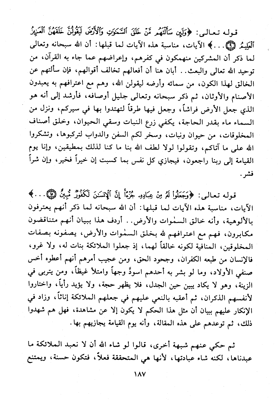 قوله تعالى: {وَلَئِنْ سَأَلْتَهُمْ مَنْ خَلَقَ السَّمَاوَاتِ وَالْأَرْضَ لَيَقُولُنَّ خَلَقَهُنَّ الْعَزِيزُ الْعَلِيمُ (9) ...} الآيات، مناسبة هذه الآيات لما قبلها: أن الله سبحانه وتعالى لما ذكر أن المشركين منهمكون في كفرهم، وإعراضهم عما جاء به القرآن، من توحيد الله تعالى والبعث .. أبان هنا أن أفعالهم تخالف أقوالهم، فإن سألتهم عن الخالق لهذا الكون، من سمائه وأرضه ليقولن الله، وهم مع اعترافهم به يعبدون الأصنام والأوثان، ثم ذكر سبحانه وتعالى جليل أوصافه، فأرشد إلى أنه هو الذي جعل الأرض فراشًا، وجعل فيها طرقًا لتهتدوا بها في سيركم، ونزل من السماء ماء بقدر الحاجة، يكفي زرع النبات وسقي الحيوان، وخلق أصناف المخلوقات، من حيوان ونبات، وسخر لكم السفن والدواب لتركبوها، وتشكروا الله على ما آتاكم، وتقولوا لولا لطف الله بنا ما كنا لذلك بمطيقين، وإنا يوم القيامة إلى ربنا راجعون، فيجازي كل نفس بما كسبت إن خيرًا فخير، وإن شرًا فشر.