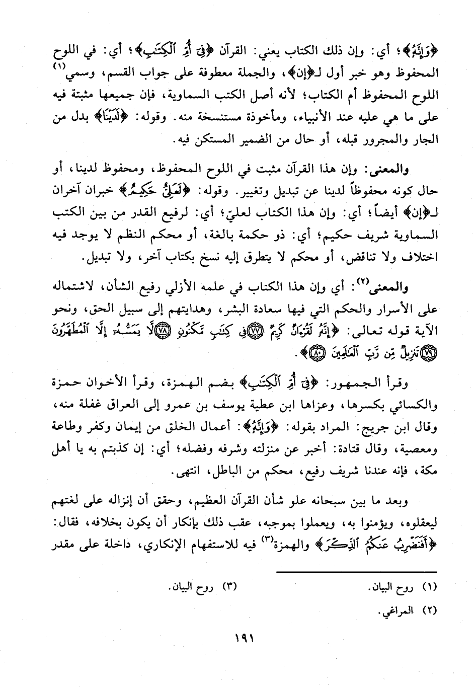 وقرأ الجمهور: {فِي أُمِّ الْكِتَابِ} بضم الهمزة، وقرأ الأخوان حمزة والكسائي بكسرها، وعزاها ابن عطية يوسف بن عمرو إلى العراق غفلة منه، وقال ابن جريج: المراد بقوله: {وَإِنَّهُ}: أعمال الخلق من إيمان وكفر وطاعة ومعصية، وقال قتادة: أخبر عن منزلته وشرفه وفضله؛ أي: إن كذبتم به يا أهل مكة، فإنه عندنا شريف رفيع، محكم من الباطل، انتهى.