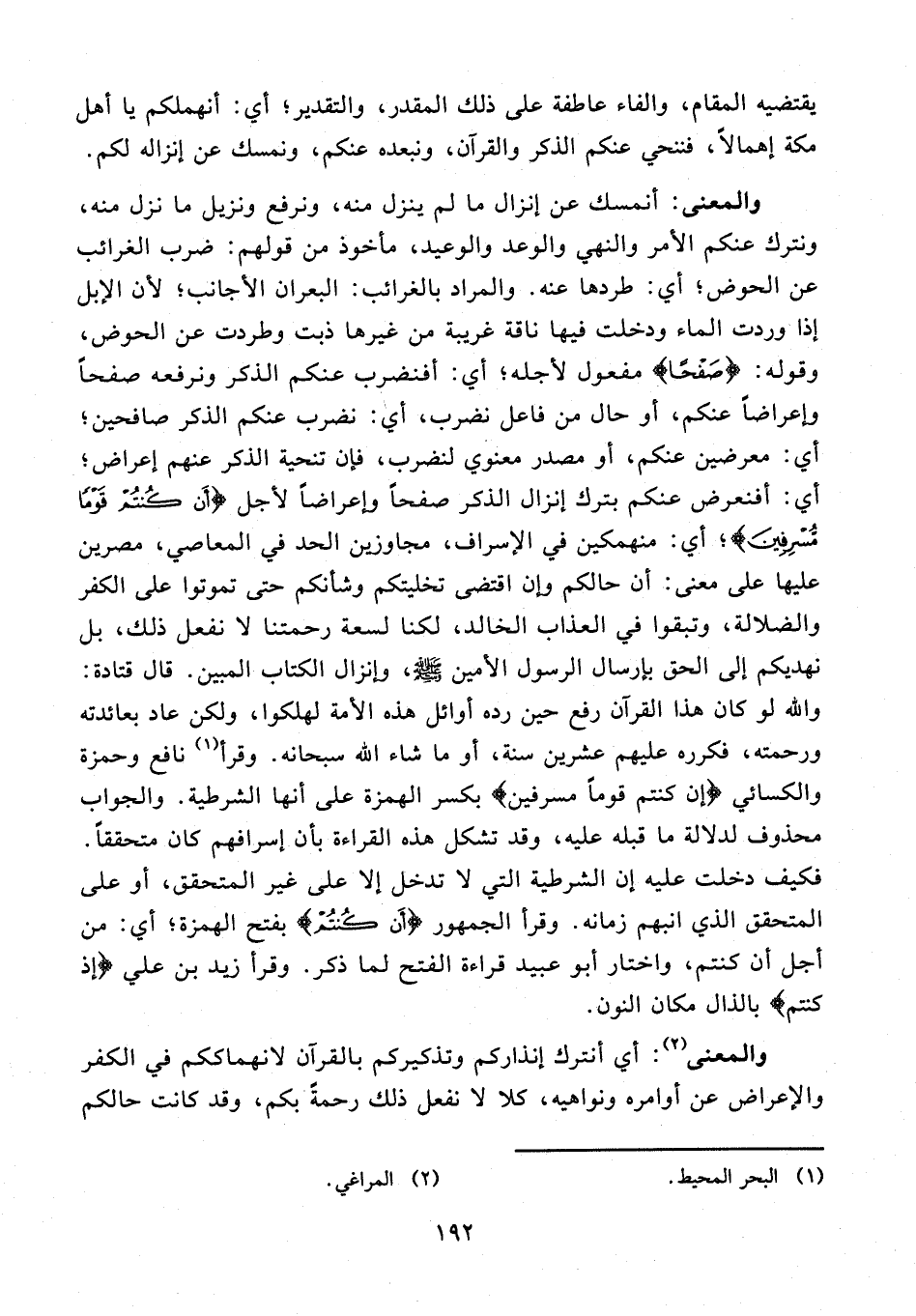 والمعنى: أنمسك عن إنزال ما لم ينزل منه، ونرفع ونزيل ما نزل منه، ونترك عنكم الأمر والنهي والوعد والوعيد، مأخوذ من قولهم: ضرب الغرائب عن الحوض؛ أي: طردها عنه. والمراد بالغرائب: البعران الأجانب؛ لأن الإبل إذا وردت الماء ودخلت فيها ناقة غريبة من غيرها ذبت وطردت عن الحوض، وقوله: {صَفْحًا} مفعول لأجله؛ أي: أفنضرب عنكم الذكر ونرفعه صفحًا وإعراضًا عنكم، أو حال من فاعل نضرب، أي: نضرب عنكم الذكر صافحين؛ أي: معرضين عنكم، أو مصدر معنوي لنضرب، فإن تنحية الذكر عنهم إعراض؛ أي: أفنعرض عنكم بترك إنزال الذكر صفحًا وإعراضًا لأجل {أَنْ كُنْتُمْ قَوْمًا مُسْرِفِينَ}؛ أي: منهمكين في الإسراف، مجاوزين الحد في المعاصي، مصرين عليها على معنى: أن حالكم وإن اقتضى تخليتكم وشأنكم حتى تموتوا على الكفر والضلالة، وتبقوا في العذاب الخالد، لكنا لسعة رحمتنا لا نفعل ذلك، بل نهديكم إلى الحق بإرسال الرسول الأمين - صلى الله عليه وسلم -، وإنزال الكتاب المبين. قال قتادة: والله لو كان هذا القرآن رفع حين رده أوائل هذه الأمة لهلكوا, ولكن عاد بعائدته ورحمته، فكرره عليهم عشرين سنة، أو ما شاء الله سبحانه. وقرأ (¬1) نافع وحمزة والكسائي {إن كنتم قومًا مسرفين} بكسر الهمزة على أنها الشرطية. والجواب محذوف لدلالة ما قبله عليه، وقد تشكل هذه القراءة بأن إسرافهم كان متحققًا. فكيف دخلت عليه إن الشرطية التي لا تدخل إلا على غير المتحقق، أو على المتحقق الذي انبهم زمانه. وقرأ الجمهور {أَنْ كُنْتُمْ} بفتح الهمزة؛ أي: من أجل أن كنتم، واختار أبو عبيد قراءة الفتح لما ذكر. وقرأ زيد بن علي {إذ كنتم} بالذال مكان النون.