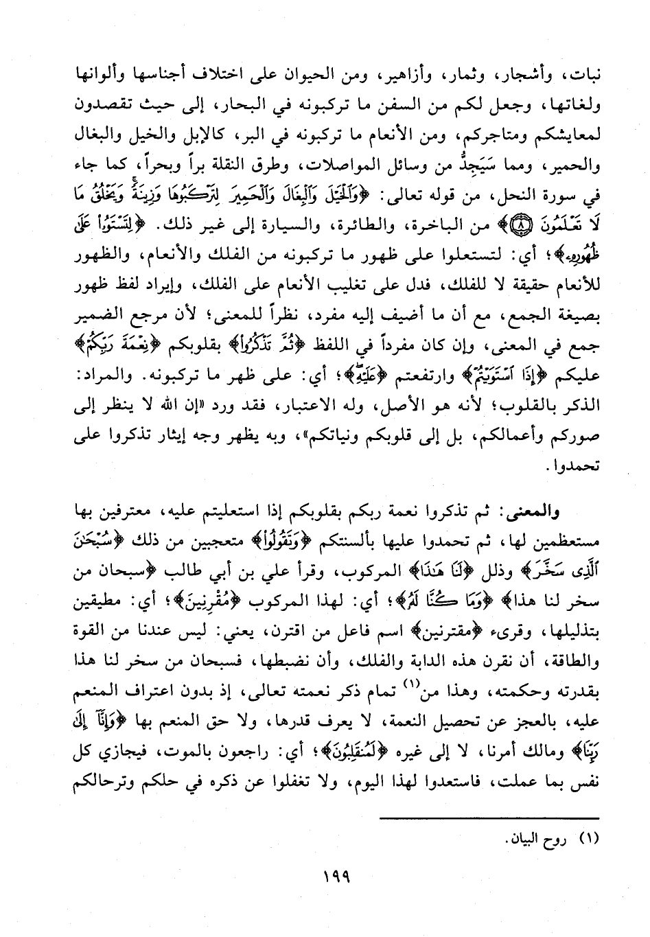 13 - {لِتَسْتَوُوا عَلَى ظُهُورِهِ}؛ أي: لتستعلوا على ظهور ما تركبونه من الفلك والأنعام، والظهور للأنعام حقيقة لا للفلك، فدل على تغليب الأنعام على الفلك، وإيراد لفظ ظهور بصيغة الجمع، مع أن ما أضيف إليه مفرد، نظرًا للمعنى؛ لأن مرجع الضمير جمع في المعنى، وإن كان مفردًا في اللفظ {ثُمَّ تَذْكُرُوا} بقلوبكم {نِعْمَةَ رَبِّكُمْ} عليكم {إِذَا اسْتَوَيْتُمْ} وارتفعتم {عَلَيْهِ}؛ أي: على ظهر ما تركبونه. والمراد: الذكر بالقلوب؛ لأنه هو الأصل، وله الاعتبار، فقد ورد "إن الله لا ينظر إلى صوركم وأعمالكم، بل إلى قلوبكم ونياتكم"، وبه يظهر وجه إيثار تذكروا على تحمدوا.