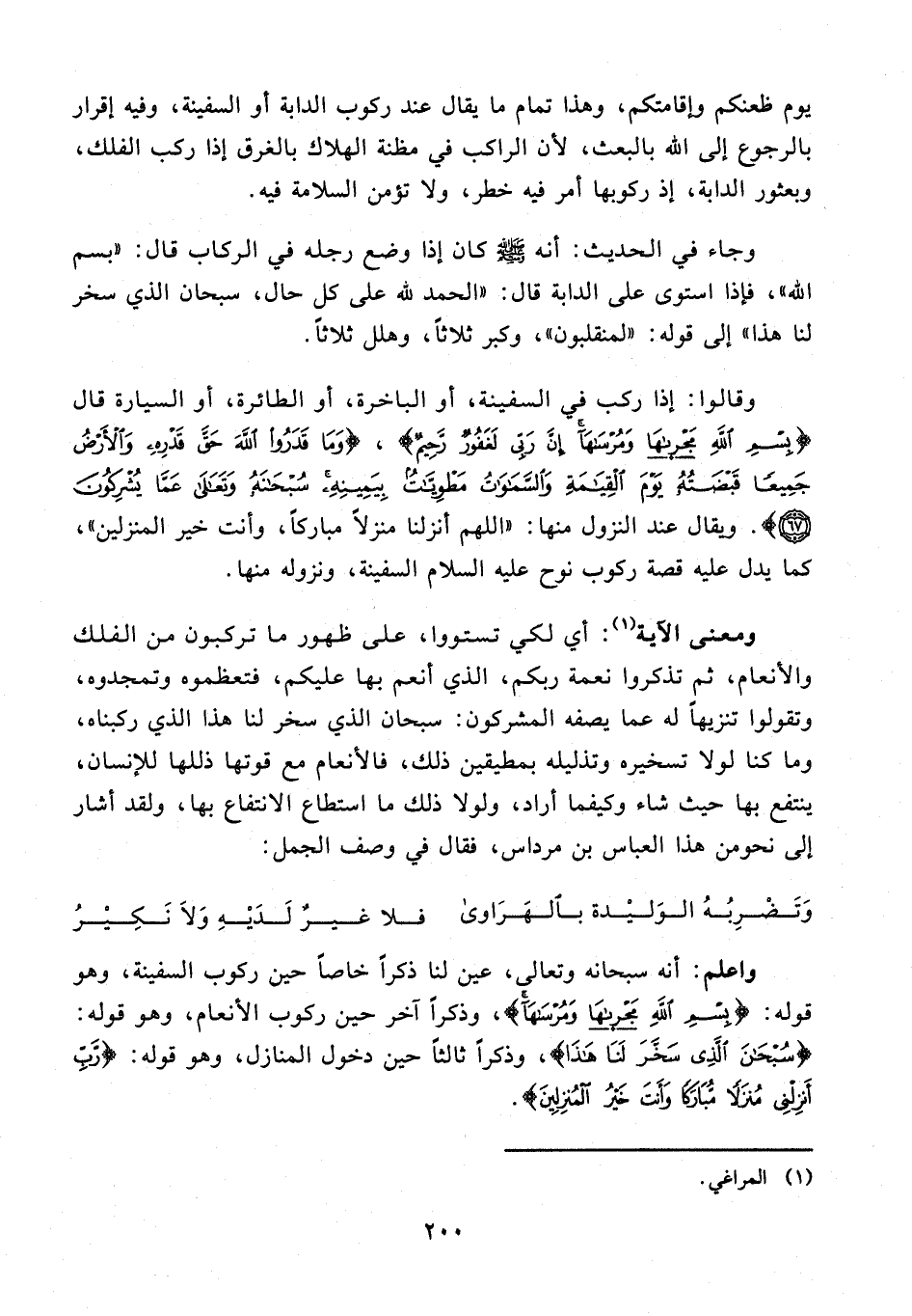 وقالوا: إذا ركب في السفينة، أو الباخرة، أو الطائرة، أو السيارة قال {بِسْمِ اللَّهِ مَجْرَاهَا وَمُرْسَاهَا إِنَّ رَبِّي لَغَفُورٌ رَحِيمٌ}، {وَمَا قَدَرُوا اللَّهَ حَقَّ قَدْرِهِ وَالْأَرْضُ جَمِيعًا قَبْضَتُهُ يَوْمَ الْقِيَامَةِ وَالسَّمَاوَاتُ مَطْوِيَّاتٌ بِيَمِينِهِ سُبْحَانَهُ وَتَعَالَى عَمَّا يُشْرِكُونَ (67)}. ويقال عند النزول منها: "اللهم أنزلنا منزلًا مباركًا، وأنت خير المنزلين"، كما يدل عليه قصة ركوب نوح عليه السلام السفينة، ونزوله منها.