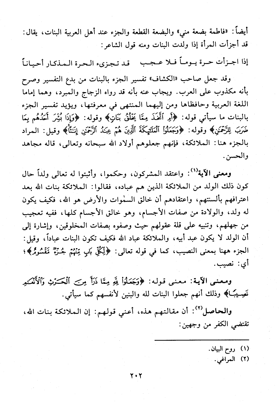 وقد جعل صاحب "الكشاف" تفسير الجزء بالبنات من بدع التفسير وصرح بأنه مكذوب على العرب. ويجاب عنه بأنه قد رواه الزجاج والمبرد، وهما إماما اللغة العربية وحافظاها ومن إليهما المنتهى في معرفتها، ويؤيد تفسير الجزء بالبنات ما سيأتي قوله: {أَمِ اتَّخَذَ مِمَّا يَخْلُقُ بَنَاتٍ} وقوله: {وَإِذَا بُشِّرَ أَحَدُهُمْ بِمَا ضَرَبَ لِلرَّحْمَنِ} وقوله: {وَجَعَلُوا الْمَلَائِكَةَ الَّذِينَ هُمْ عِبَادُ الرَّحْمَنِ إِنَاثًا} وقيل: المراد بالجزء هنا: الملائكة، فإنهم جعلوهم أولاد الله سبحانه وتعالى، قاله مجاهد والحسن.