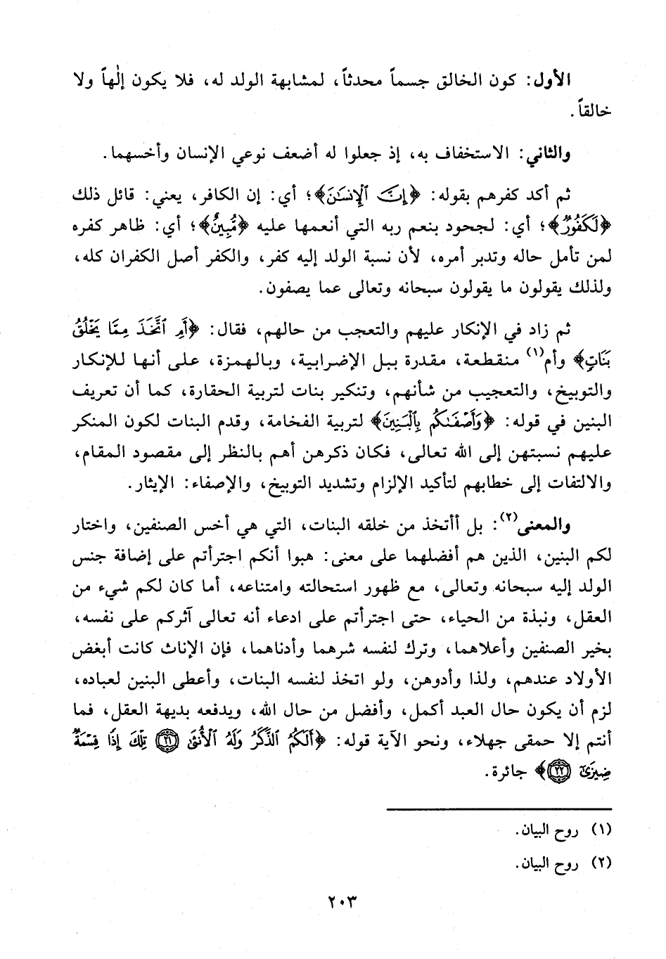 16 - ثم زاد في الإنكار عليهم والتعجب من حالهم، فقال: {أَمِ اتَّخَذَ مِمَّا يَخْلُقُ بَنَاتٍ} وأم (¬1) منقطعة، مقدرة ببل الإضرابية، وبالهمزة، على أنها للإنكار والتوبيخ، والتعجب من شأنهم، وتنكير بنات لتربية الحقارة، كما أن تعريف البنين في قوله: {وَأَصْفَاكُمْ بِالْبَنِينَ} لتربية الفخامة، وقدم البنات لكون المنكر عليهم نسبتهن إلى الله تعالى، فكان ذكرهن أهم بالنظر إلى مقصود المقام، والالتفات إلى خطابهم لتأكيد الإلزام وتشديد التوبيخ، والإصفاء: الإيثار.