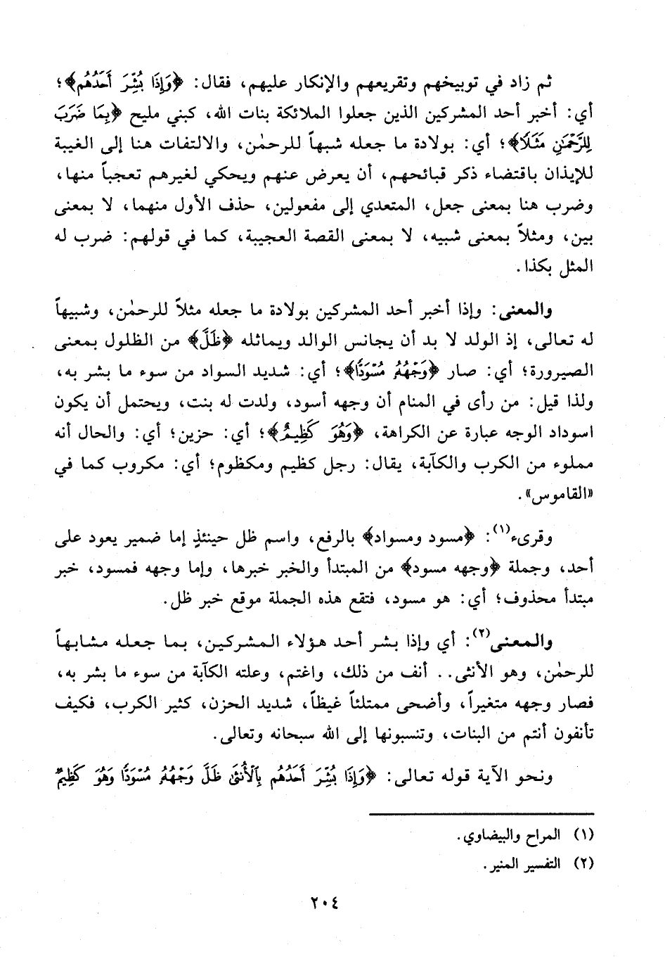 ونحو الآية قوله تعالى: {وَإِذَا بُشِّرَ أَحَدُهُمْ بِالْأُنْثَى ظَلَّ وَجْهُهُ مُسْوَدًّا وَهُوَ كَظِيمٌ (58)