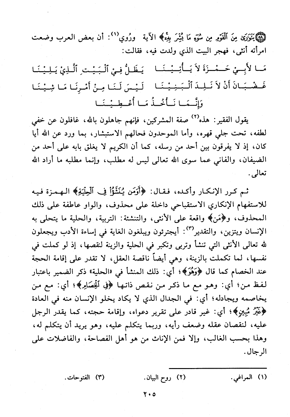 18 - ثم كرر الإنكار وأكده، فقال: {أَوَمَنْ يُنَشَّأُ فِي الْحِلْيَةِ} الهمزة فيه للاستفهام الإنكاري الاستقباحي داخلة على محذوف، والواو عاطفة على ذلك المحذوف، و {مَن} واقعة على الأنثى، والتنشئة: التربية، والحلية ما يتحلى به الإنسان ويتزين، والتقدير (¬3): أيجترئون ويبلغون الغاية في إساءة الأدب ويجعلون لله تعالى الأنثى التي تنشأ وتربى وتكبر في الحلية والزينة لنقصها، إذ لو كملت في نفسها، لما تكملت بالزينة، وهي أيضًا ناقصة العقل، لا تقدر على إقامة الحجة عند الخصام كما قال {وَهُوَ}؛ أي: ذلك المنشأ في "الحلية" ذكر الضمير باعتبار لفظ من؛ أي: وهو مع ما ذكر من نقص ذاتها {فِي الْخِصَامِ}؛ أي: مع من يخاصمه ويجادله؛ أي: في الجدال الذي لا يكاد يخلو الإنسان منه في العادة {غَيْرُ مُبِينٍ}؛ أي: غير قادر على تقرير دعواه، وإقامة حجته، كما يقدر الرجل عليه، لنقصان عقله وضعف رأيه، وربما يتكلم عليه، وهو يريد أن يتكلم له، وهذا بحسب الغالب، وإلا فمن الإناث من هو أهل الفصاحة، والفاضلات على الرجال.