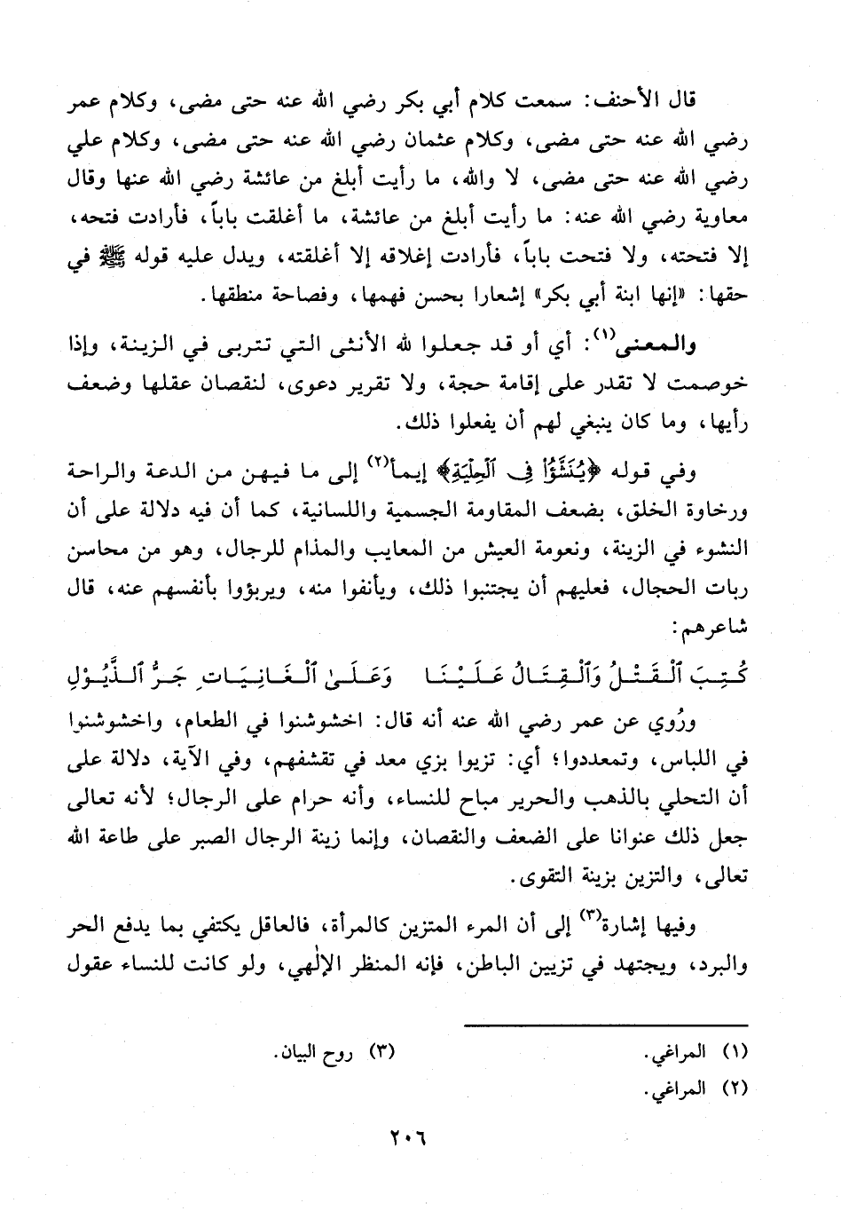 ورُوي عن عمر - رضي الله عنه - أنه قال: اخشوشنوا في الطعام، واخشوشنوا في اللباس، وتمعددوا؛ أي: تزيوا بزي معد في تقشفهم، وفي الآية، دلالة على أن التحلي بالذهب والحرير مباح للنساء، وأنه حرام على الرجال؛ لأنه تعالى جعل ذلك عنوانا على الضعف والنقصان، وإنما زينة الرجال الصبر على طاعة الله تعالى، والتزين بزينة التقوى.