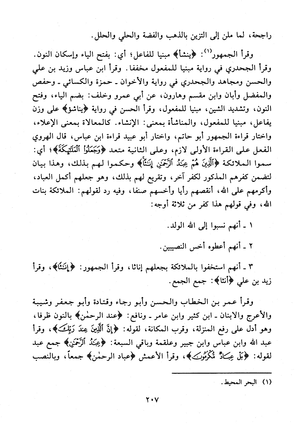 وقرأ عمر بن الخطاب والحسن وأبو رجاء وقتادة وأبو جعفر وشيبة والأعرج والابنان - ابن كثير وابن عامر - ونافع: {عند الرحمن} بالنون ظرفا، وهو أدل على رفع المنزلة، وقرب المكانة، لقوله: {إِنَّ الَّذِينَ عِنْدَ رَبِّكَ}، وقرأ عبد الله وابن عباس وابن جبير وعلقمة وباقي السبعة: {عِبَادُ الرَّحْمَنِ} جمع عبد لقوله: {بَلْ عِبَادٌ مُكْرَمُونَ}، وقرأ الأعمش {عباد الرحمن} جمعًا، وبالنصب