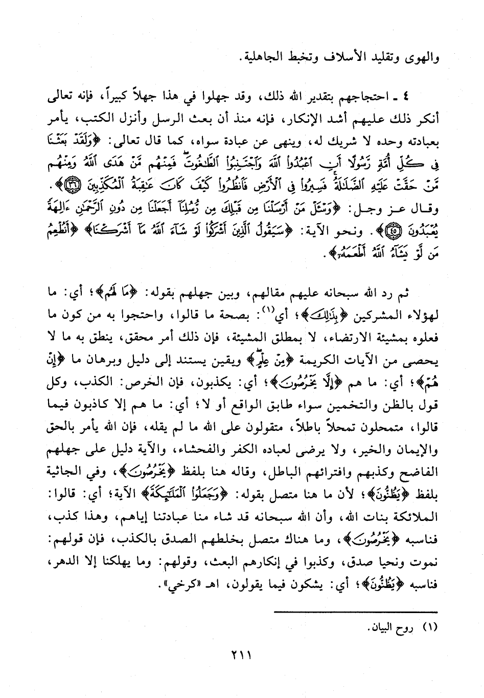 4 - احتجاجهم بتقدير الله ذلك، وقد جهلوا في هذا جهلًا كبيرًا، فإنه تعالى أنكر ذلك عليهم أشد الإنكار، فإنه منذ أن بعث الرسل وأنزل الكتب، يأمر بعبادته وحده لا شريك له، وينهى عن عبادة سواه، كما قال تعالى: {وَلَقَدْ بَعَثْنَا فِي كُلِّ أُمَّةٍ رَسُولًا أَنِ اعْبُدُوا اللَّهَ وَاجْتَنِبُوا الطَّاغُوتَ فَمِنْهُمْ مَنْ هَدَى اللَّهُ وَمِنْهُمْ مَنْ حَقَّتْ عَلَيْهِ الضَّلَالَةُ فَسِيرُوا فِي الْأَرْضِ فَانْظُرُوا كَيْفَ كَانَ عَاقِبَةُ الْمُكَذِّبِينَ (36)}. وقال عز وجل: {وَاسْأَلْ مَنْ أَرْسَلْنَا مِنْ قَبْلِكَ مِنْ رُسُلِنَا أَجَعَلْنَا مِنْ دُونِ الرَّحْمَنِ آلِهَةً يُعْبَدُونَ (45)}. ونحو الآية: {سَيَقُولُ الَّذِينَ أَشْرَكُوا لَوْ شَاءَ اللَّهُ مَا أَشْرَكْنَا} {أَنُطْعِمُ مَنْ لَوْ يَشَاءُ اللَّهُ أَطْعَمَهُ}.