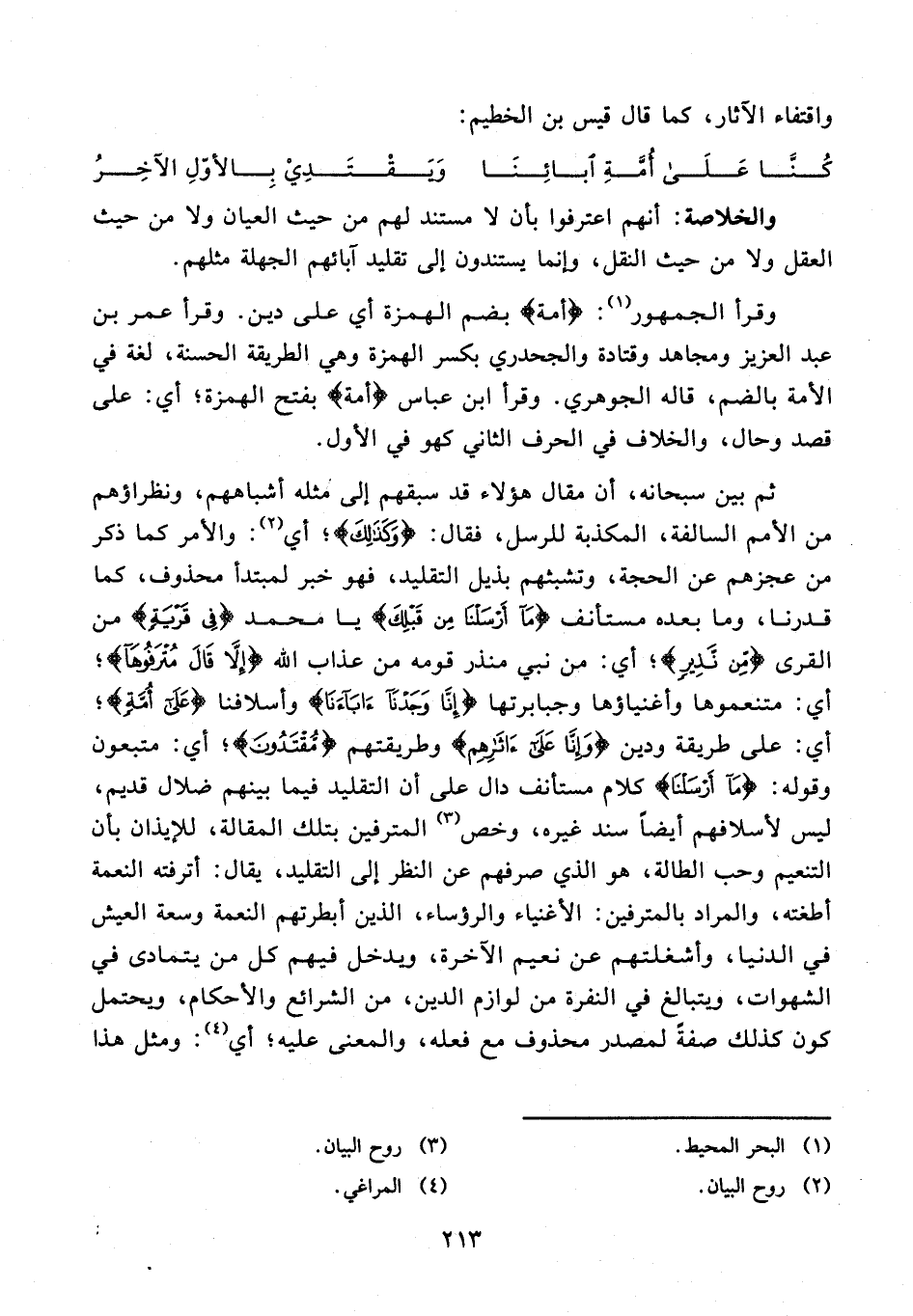 23 - ثم بين سبحانه، أن مقال هؤلاء قد سبقهم إلى مثله أشباههم، ونظراؤهم من الأمم السالفة، المكذبة للرسل، فقال: {وَكَذَلِكَ}؛ أي (¬2): والأمر كما ذكر من عجزهم عن الحجة، وتشبثهم بذيل التقليد، فهو خبر لمبتدأ محذوف، كما قدرنا، وما بعده مستأنف {مَا أَرْسَلْنَا مِنْ قَبْلِكَ} يا محمد {فِي قَرْيَةٍ} من القرى {مِنْ نَذِيرٍ}؛ أي: من نبي منذر قومه من عذاب الله {إِلَّا قَالَ مُتْرَفُوهَا}؛ أي: متنعموها وأغنياؤها وجبابرتها {إِنَّا وَجَدْنَا آبَاءَنَا} وأسلافنا {عَلَى أُمَّةٍ}؛ أي: على طريقة ودين {وَإِنَّا عَلَى آثَارِهِمْ} وطريقتهم {مُقْتَدُونَ}؛ أي: متبعون وقوله: {مَا أَرْسَلْنَا} كلام مستأنف قال على أن التقليد فيما بينهم ضلال قديم، ليس لأسلافهم أيضًا سند غيره، وخص (¬3) المترفين بتلك المقالة، للإيذان بأن التنعيم وحب الطالة، هو الذي صرفهم عن النظر إلى التقليد، يقال: أترفته النعمة أطغته، والمراد بالمترفين: الأغنياء والرؤساء، الذين أبطرتهم النعمة وسعة العيش في الدنيا، وأشغلتهم عن نعيم الآخرة، ويدخل فيهم كل من يتمادى في الشهوات، ويتبالغ في النفرة من لوازم الدين، من الشرائع والأحكام، ويحتمل كون كذلك صفةً لمصدر محذوف مع فعله، والمعنى عليه؛ أي (¬4): ومثل هذا