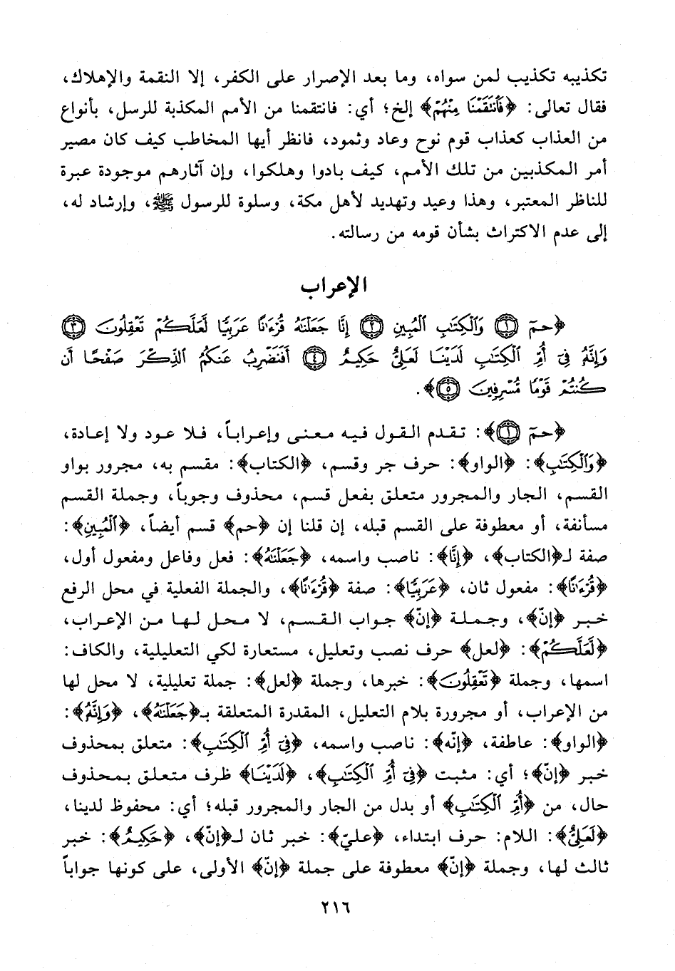 {حم (1) وَالْكِتَابِ الْمُبِينِ (2) إِنَّا جَعَلْنَاهُ قُرْآنًا عَرَبِيًّا لَعَلَّكُمْ تَعْقِلُونَ (3) وَإِنَّهُ فِي أُمِّ الْكِتَابِ لَدَيْنَا لَعَلِيٌّ حَكِيمٌ (4) أَفَنَضْرِبُ عَنْكُمُ الذِّكْرَ صَفْحًا أَنْ كُنْتُمْ قَوْمًا مُسْرِفِينَ (5)}.