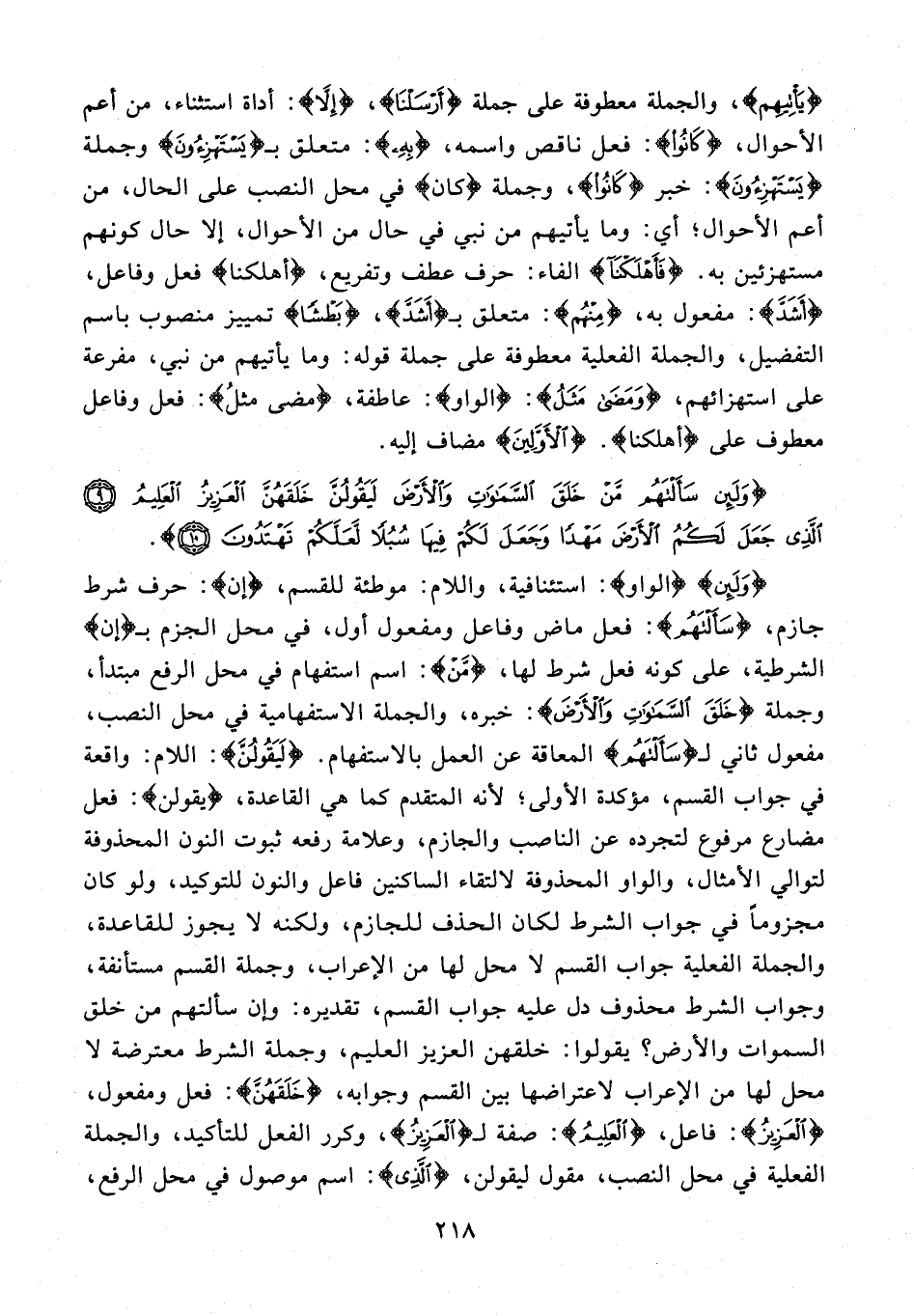 {وَلَئِنْ} {الواو}: استئنافية، واللام: موطئة للقسم، {إن}: حرف شرط جازم، {سَأَلْتَهُمْ}: فعل ماض وفاعل ومفعول أول، في محل الجزم بـ {إن} الشرطية، على كونه فعل شرط لها، {مَنْ}: اسم استفهام في محل الرفع مبتدأ، وجملة {خَلَقَ السَّمَاوَاتِ وَالْأَرْضَ}: خبره، والجملة الاستفهامية في محل النصب، مفعول ثاني لـ {سَأَلْتَهُمْ} المعاقة عن العمل بالاستفهام. {لَيَقُولُنَّ}: اللام: واقعة في جواب القسم، مؤكدة الأولى؛ لأنه المتقدم كما هي القاعدة، {يقولن}: فعل مضارع مرفوع لتجرده عن الناصب والجازم، وعلامة رفعه ثبوت النون المحذوفة لتوالي الأمثال، والواو المحذوفة لالتقاء الساكنين فاعل والنون للتوكيد، ولو كان مجزومًا في جواب الشرط لكان الحذف للجازم، ولكنه لا يجوز للقاعدة، والجملة الفعلية جواب القسم لا محل لها من الإعراب، وجملة القسم مستأنفة، وجواب الشرط محذوف دل عليه جواب القسم، تقديره: وإن سألتهم من خلق السموات والأرض؟ يقولوا: خلقهن العزيز العلم، وجملة الشرط معترضة لا محل لها من الإعراب لاعتراضها بين القسم وجوابه، {خَلَقَهُنَّ}: فعل ومفعول، {الْعَزِيزُ}: فاعل، {الْعَلِيمُ}: صفة لـ {الْعَزِيزُ}، وكرر الفعل للتأكيد، والجملة الفعلية في محل النصب، مقول ليقولن، {الَّذِي}: اسم موصول في محل الرفع،
