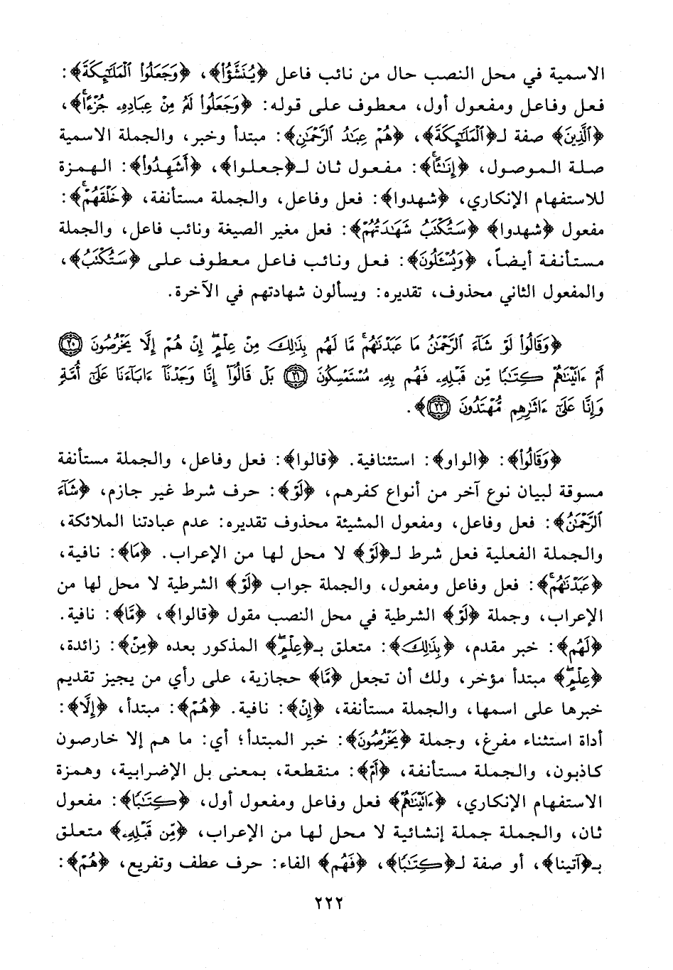 {وَقَالُوا}: {الواو}: استئنافية. {قالوا}: فعل وفاعل، والجملة مستأنفة مسوقة لبيان نوع آخر من أنواع كفرهم، {لَوْ}: حرف شرط غير جازم، {شَاءَ الرَّحْمَنُ}: فعل وفاعل، ومفعول المشيئة محذوف تقديره: عدم عبادتنا الملائكة، والجملة الفعلية فعل شرط لـ {لَوْ} لا محل لها من الإعراب. {مَا}: نافية، {عَبَدْنَاهُمْ}: فعل وفاعل ومفعول، والجملة جواب {لَوْ} الشرطية لا محل لها من الإعراب، وجملة {لَوْ} الشرطية في محل النصب مقول {قالوا}، {مَا}: نافية. {لَهُمْ}: خبر مقدم، {بِذَلِكَ}: متعلق بـ {عِلْمٍ} المذكور بعده {من}: زائدة، {عِلْمٍ} مبتدأ مؤخر، ولك أن تجعل {مَا} حجازية، على رأي من يجيز تقديم خبرها على اسمها، والجملة مستأنفة، {إِنْ}: نافية. {هُمْ}: مبتدأ، {إِلَّا}: أداة استثناء مفرغ، وجملة {يَخْرُصُونَ}: خبر المبتدأ؛ أي: ما هم إلا خارصون كاذبون، والجملة مستأنفة، {أَمْ}: منقطعة، بمعنى بل الإضرابية، وهمزة الاستفهام الإنكاري، {آتَيْنَاهُمْ} فعل وفاعل ومفعول أول، {كِتَابًا}: مفعول ثان، والجملة جملة إنشائية لا محل لها من الإعراب، {مِنْ قَبْلِهِ} متعلق بـ {آتينا}، أو صفة لـ {كِتَابًا}، {فَهُمْ} الفاء: حرف عطف وتفريع، {هُمْ}: