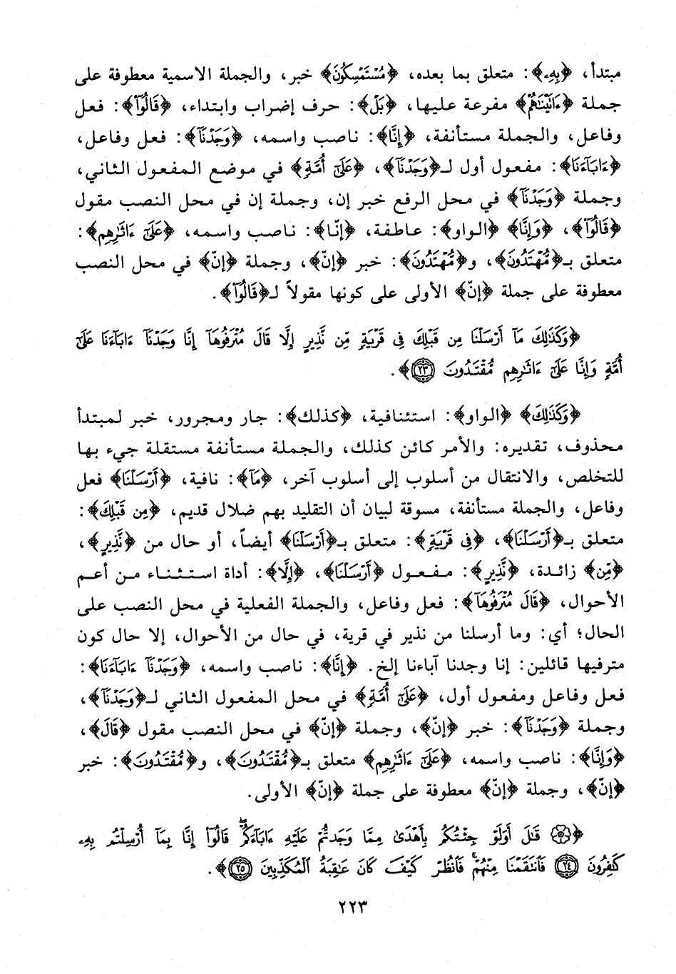 {وَكَذَلِكَ} {الواو}: استئنافية، {كذلك}: جار ومجرور، خبر لمبتدأ محذوف، تقديره: والأمر كائن كذلك، والجملة مستأنفة مستقلة جيء بها للتخلص، والانتقال من أسلوب إلى أسلوب آخر، {مَا}: نافية، {أَرْسَلْنَا} فعل وفاعل، والجملة مستأنفة، مسوقة لبيان أن التقليد بهم ضلال قديم، {مِنْ قَبْلِكَ}: متعلق بـ {أَرْسَلْنَا}، {فِي قَرْيَةٍ}: متعلق بـ {أَرْسَلْنَا} أيضًا، أو حال من {نَذِيرٍ}، {مِنْ} زائدة، {نَذِيرٍ}: مفعول {أَرْسَلْنَا}، {إِلَّا}: أداة استثناء من أعم الأحوال، {قَالَ مُتْرَفُوهَا}: فعل وفاعل، والجملة الفعلية في محل النصب على الحال؛ أي: وما أرسلنا من نذير في قرية، في حال من الأحوال، إلا حال كون مترفيها قائلين: إنا وجدنا آباءنا إلخ. {إِنَّا}: ناصب واسمه، {وَجَدْنَا آبَاءَنَا}: فعل وفاعل ومفعول أول، {عَلَى أُمَّةٍ} في محل المفعول الثاني لـ {وَجَدْنَا}، وجملة {وَجَدْنَا}: خبر {إنّ}، وجملة {إنّ} في محل النصب مقول {قَالَ}، {إِنَّا}: ناصب واسمه، {عَلَى آثَارِهِمْ} متعلق بـ {مُقْتَدُونَ}، و {مُقْتَدُونَ}: خبر {إنّ}، وجملة {إنّ} معطوفة على جملة {إنّ} الأولى.