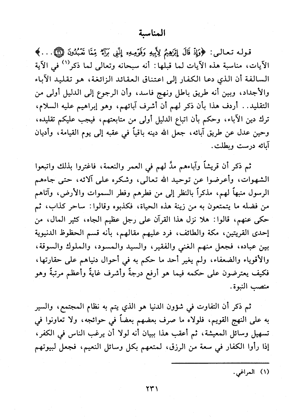 قوله تعالى: {وَإِذْ قَالَ إِبْرَاهِيمُ لِأَبِيهِ وَقَوْمِهِ إِنَّنِي بَرَاءٌ مِمَّا تَعْبُدُونَ (26) ...} الآيات، مناسبة هذه الآيات لما قبلها: أنه سبحانه وتعالى لما ذكر (¬1) في الآية السالفة أن الذي دعا الكفار إلى اعتناق العقائد الزائغة، هو تقليد الآباء والأجداد، وبين أنه طريق باطل ونهج فاسد، وأن الرجوع إلى الدليل أولى من التقليد .. أردف هذا بأن ذكر لهم أن أشرف آبائهم، وهو إبراهيم عليه السلام، ترك دين الآباء، وحكم بأن اتباع الدليل أولى من متابعتهم، فيجب عليكم تقليده، وحين عدل عن طريق آبائه، جعل الله دينه باقيًا في عقبه إلى يوم القيامة، وأديان آبائه درست وبطلت.