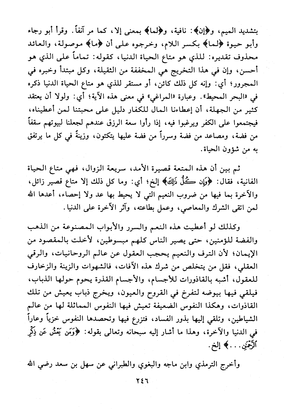 وكذلك لو أعطيت هذه النعم والسرر والأبواب المصنوعة من الذهب والفضة للؤمنين، حتى يصير الناس كلهم مبسوطين، لأخلت بالمقصود من الإيمان؛ لأن الترف والنعيم يحجب العقول عن عالم الروحانيات، والرقي العقلي، فقل من يتخلص من شرك هذه الآفات، فالشهوات والزينة والزخارف للعقول، أشبه بالقاذورات للأجسام، والأجسام القذرة يحوم حولها الذباب، فيلقي فيها بيوضه لتفرخ في القروح والعيون، ويخرج ذباب يعيش من تلك القاذوات، وهكذا النفوس الضعيفة تعيش فيها النفوس المماثلة لها من عالم الشياطين، وتلقي إليها بذور الفساد، فتزرع فيها وتحصدها النفوس خزيًا وعارًا في الدنيا والآخرة، وهذا ما أشار إليه سبحانه وتعالى بقوله: {وَمَنْ يَعْشُ عَنْ ذِكْرِ الرَّحْمَنِ ...} إلخ.