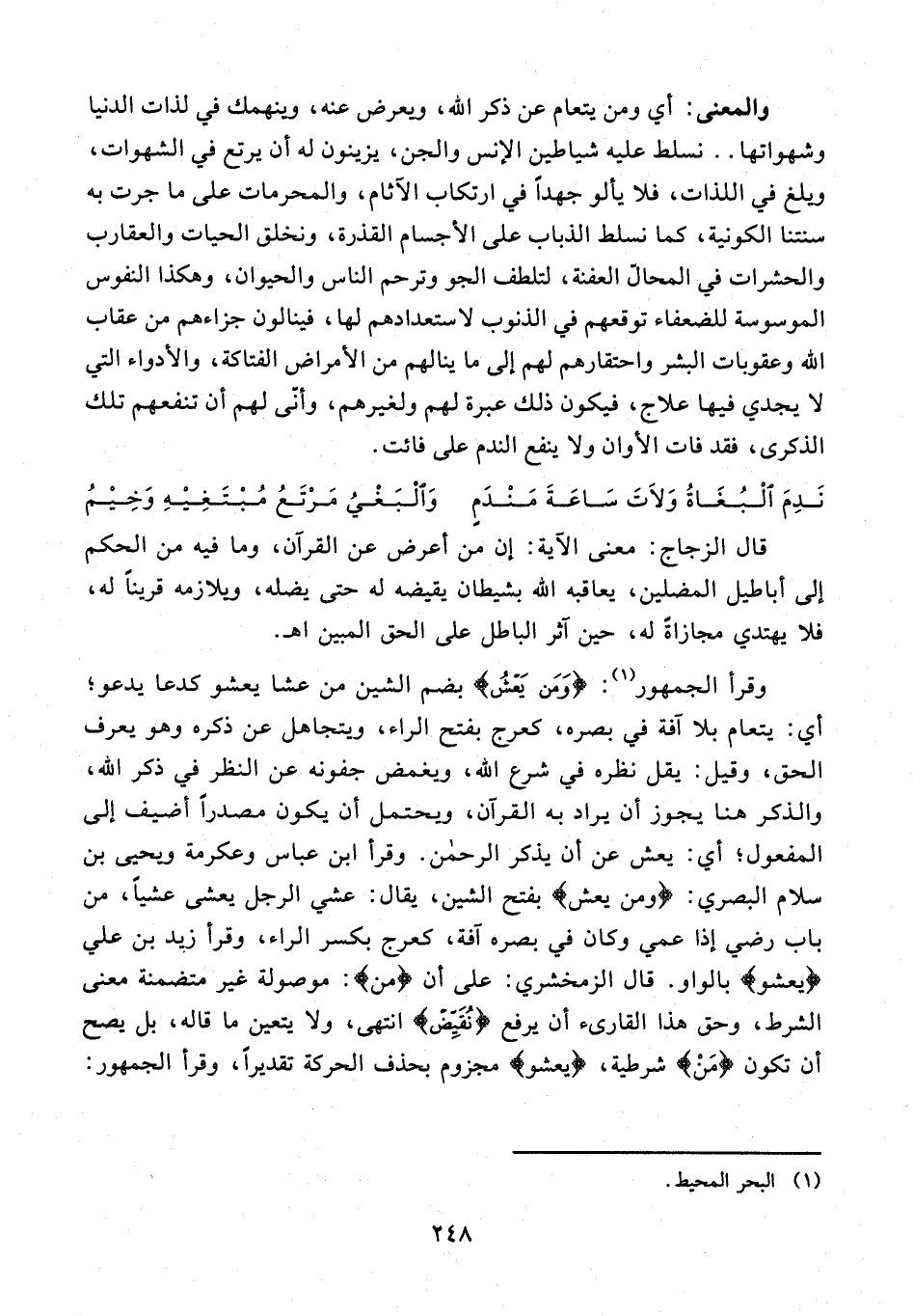 وقرأ الجمهور (¬1): {وَمَنْ يَعْشُ} بضم الشين من عشا يعشو كدعا يدعو؛ أي: يتعام بلا آفة في بصره، كعرج بفتح الراء، ويتجاهل عن ذكره وهو يعرف الحق، وقيل: يقل نظره في شرع الله، ويغمض جفونه عن النظر في ذكر الله، والذكر هنا يجوز أن يراد به القرآن، ويحتمل أن يكون مصدرًا أضيف إلى المفعول؛ أي: يعش عن أن يذكر الرحمن. وقرأ ابن عباس وعكرمة ويحيى بن سلام البصري: {ومن يعش} بفتح الشين، يقال: عشي الرجل يعشى عشيًا، من باب رضي إذا عمي وكان في بصره آفة، كعرج بكسر الراء، وقرأ زيد بن علي {يعشو} بالواو. قال الزمخشري: على أن {من}: موصولة غير متضمنة معنى الشرط، وحق هذا القارىء أن يرفع {نُقَيِّضْ} انتهى، ولا يتعين ما قاله، بل يصح أن تكون {مَنْ} شرطية، {يعشو} مجزوم بحذف الحركة تقديرًا، وقرأ الجمهور: