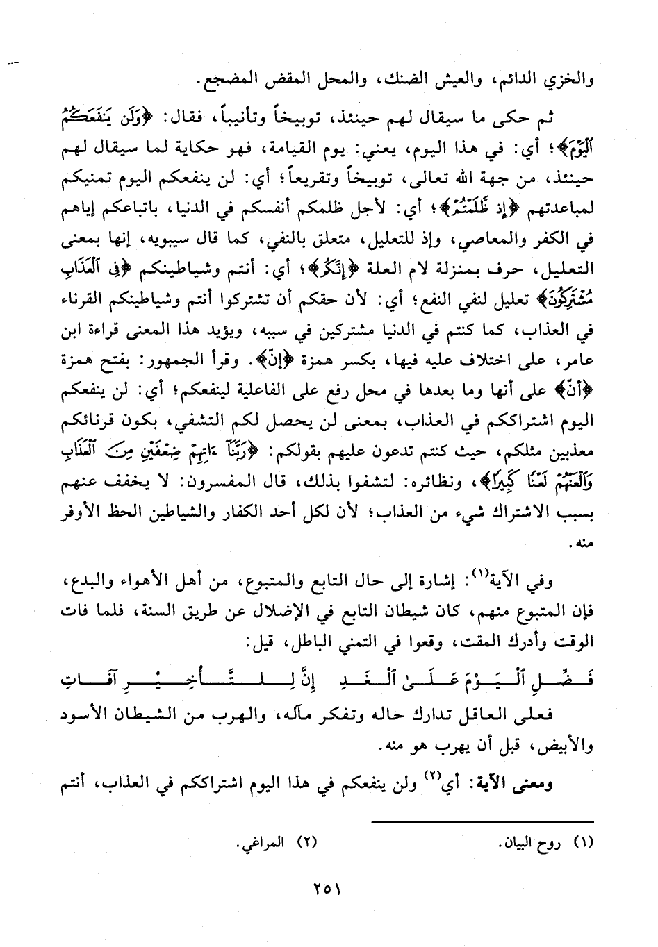 39 - ثم حكى ما سيقال لهم حينئذ، توبيخًا وتأنيبًا، فقال: {وَلَنْ يَنْفَعَكُمُ الْيَوْمَ}؛ أي: في هذا اليوم، يعني: يوم القيامة، فهو حكاية لما سيقال لهم حينئذ، من جهة الله تعالى، توبيخًا وتقريعًا؛ أي: لن ينفعكم اليوم تمنيكم لمباعدتهم {إِذْ ظَلَمْتُمْ}؛ أي: لأجل ظلمكم أنفسكم في الدنيا، باتباعكم إياهم في الكفر والمعاصي، وإذ للتعليل، متعلق بالنفي، كما قال سيبويه، إنها بمعنى التعليل، حرف بمنزلة لام العلة {أَنَّكُمْ}؛ أي: أنتم وشياطينكم {فِي الْعَذَابِ مُشْتَرِكُونَ} تعليل لنفي النفع؛ أي: لأن حقكم أن تشتركوا أنتم وشياطينكم القرناء في العذاب، كما كنتم في الدنيا مشتركين في سببه، ويؤيد هذا المعنى قراءة ابن عامر، على اختلاف عليه فيها، بكسر همزة {إنّ}. وقرأ الجمهور: بفتح همزة {إنّ} على أنها وما بعدها في محل رفع على الفاعلية لينفعكم؛ أي: لن ينفعكم اليوم اشتراككم في العذاب، بمعنى لن يحصل لكم التشفي، يكون قرنائكم معذبين مثلكم، حيث كنتم تدعون عليهم بقولكم: {رَبَّنَا آتِهِمْ ضِعْفَيْنِ مِنَ الْعَذَابِ وَالْعَنْهُمْ لَعْنًا كَبِيرًا (68)}، ونظائره: لتشفوا بذلك، قال المفسرون: لا يخفف عنهم بسبب الاشتراك شيء من العذاب؛ لأن لكل أحد الكفار والشياطين الحظ الأوفر منه.