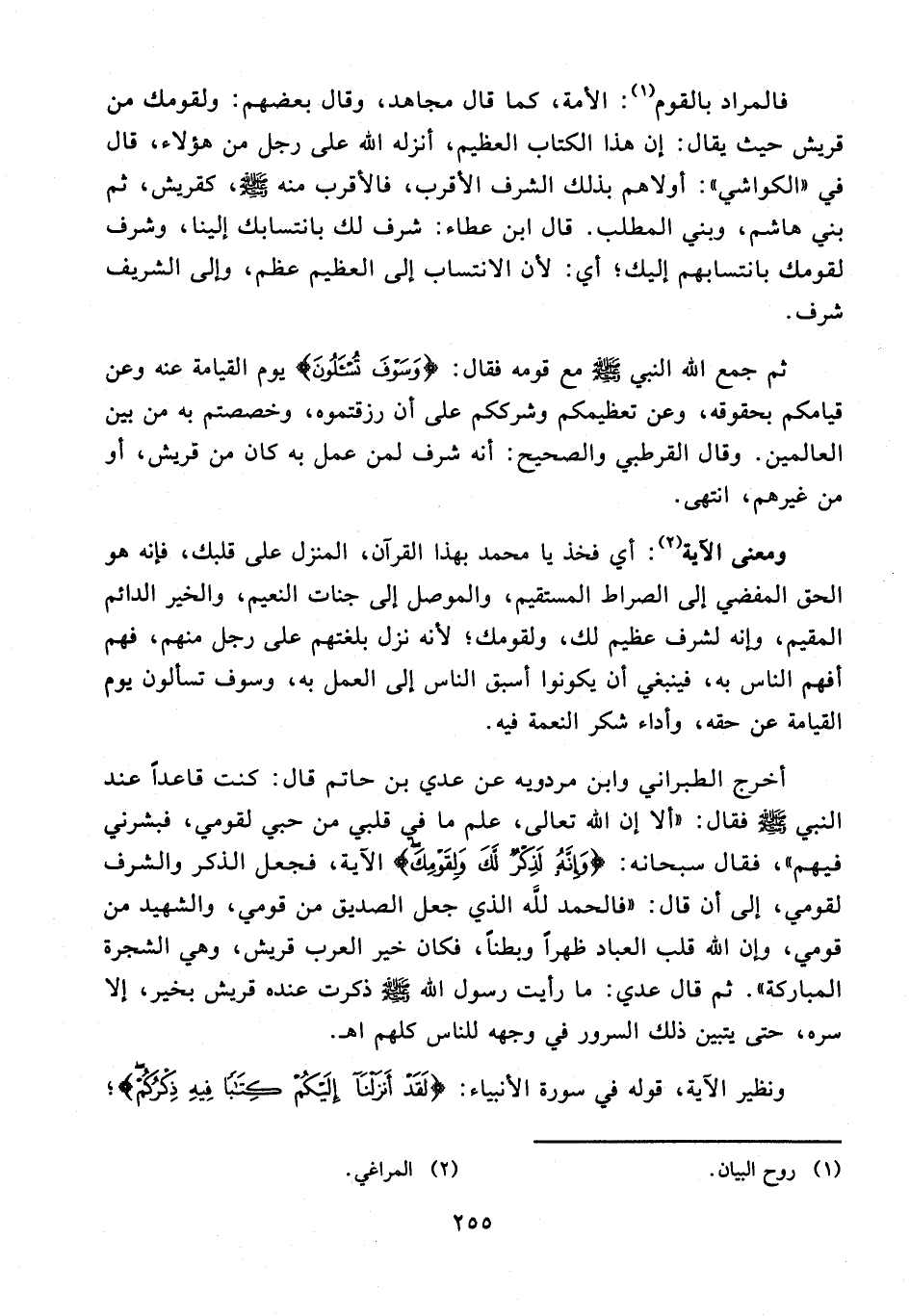 أخرج الطبراني وابن مردويه عن عدي بن حاتم قال: كنت قاعدًا عند النبي - صلى الله عليه وسلم - فقال: "ألا إن الله تعالى، علم ما في قلبي من حبي لقومي، فبشرني فيهم"، فقال سبحانه: {وَإِنَّهُ لَذِكْرٌ لَكَ وَلِقَوْمِكَ} الآية، فجعل الذكر والشرف لقومي، إلى أن قال: "فالحمد لله الذي جعل الصديق من قومي، والشهيد من قومي، وإن الله قلب العباد ظهرًا وبطنًا، فكان خير العرب قريش، وهي الشجرة المباركة". ثم قال عدي: ما رأيت رسول الله - صلى الله عليه وسلم - ذكرت عنده قريش بخير، إلا سره، حتى يتبين ذلك السرور في وجهه للناس كلهم اهـ.