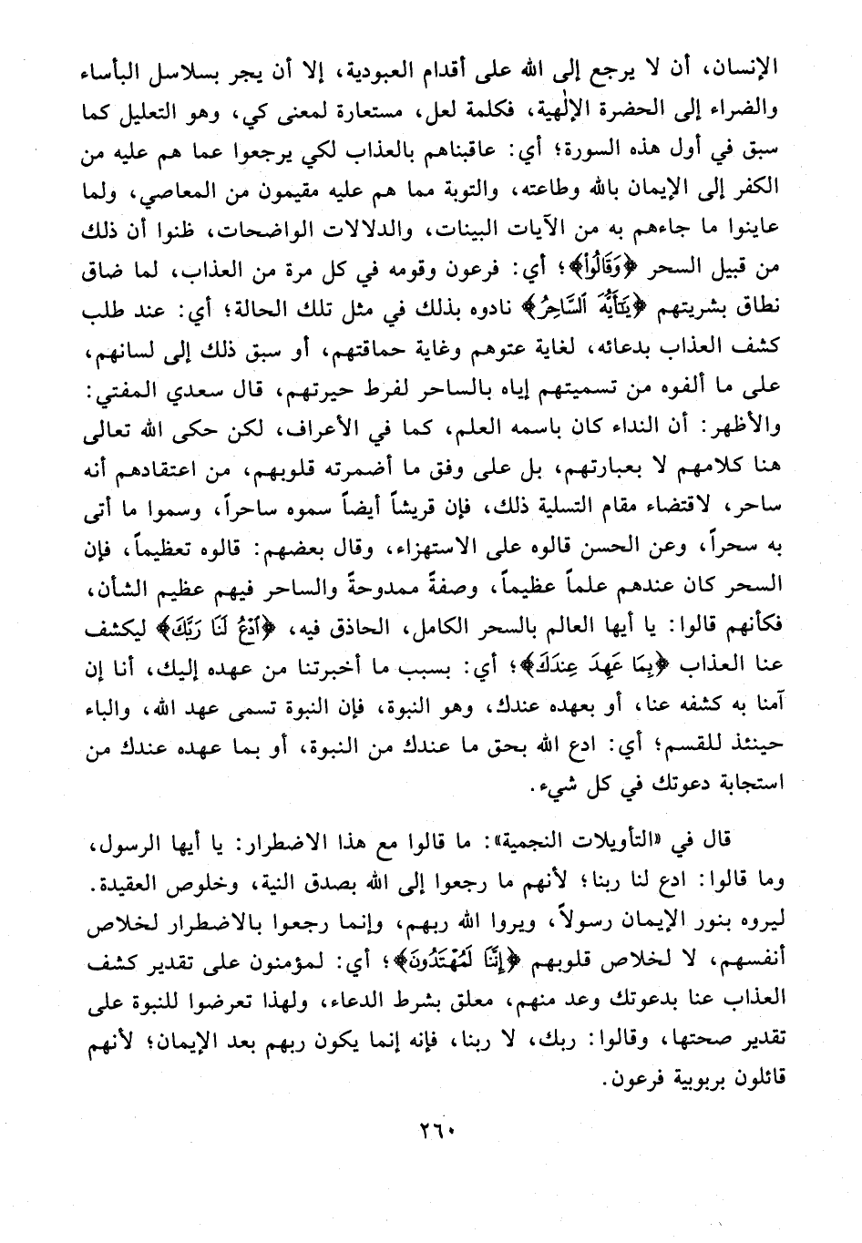 49 - ولما عاينوا ما جاءهم به من الآيات البينات، والدلالات الواضحات، ظنوا أن ذلك من قبيل السحر {وَقَالُوا}؛ أي: فرعون وقدمه في كل مرة أو العذاب، لما ضاق نطاق بشريتهم {يَا أَيُّهَ السَّاحِرُ} نادوه بذلك في مثل تلك الحالة؛ أي: عند طلب كشف العذاب بدعائه، لغاية عتوهم وغاية حماقتهم، أو سبق ذلك إلى لسانهم، على ما ألفوه من تسميتهم إياه بالساحر لفرط حيرتهم، قال سعدي المفتي: والأظهر: أن النداء كان باسمه العلم، كما في الأعراف، لكن حكى الله تعالى هذا كلامهم لا بعبارتهم، بل على وفق ما أضمرته قلوبهم، من اعتقادهم أنه ساحر، لاقتضاء مقام التسلية ذلك، فإن قريشًا أيضًا سموه ساحرًا، وسموا ما أتى به سحرًا، وعن الحسن قالوه على الاستهزاء، وقال بعضهم: قالوه تعظيمًا، فإن السحر كان عندهم علمًا عظيمًا، وصفةً ممدوحةً والساحر فيهم عظيم الشأن، فكأنهم قالوا: يا أيها العالم بالسحر الكامل، الحاذق فيه، {ادْعُ لَنَا رَبَّكَ} ليكشف عنا العذاب {بِمَا عَهِدَ عِنْدَكَ}؛ أي: بسبب ما أخبرتنا من عهده إليك، أنا من آمنا به كشفه عنا، أو بعهده عندك، وهو النبوة، فإن النبوة تسمى عهد الله، والباء حينئذ للقسم؛ أي: ادع الله بحق ما عندك من النبوة، أو بما عهده عندك من استجابة دعوتك في كل شيء.