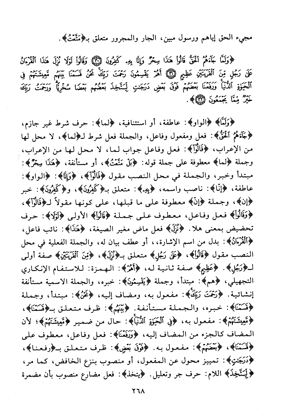 {وَلَمَّا} {الواو}: عاطفة، أو استئنافية، {لَمَّا}: حرف شرط غير جازم، {جَاءَهُمُ الْحَقُّ}: فعل ومفعول وفاعل، والجملة فعل شرط لـ {لَمَّا}، لا محل لها من الإعراب، {قَالُوا}: فعل وفاعل جواب لما، لا محل لها من الإعراب، وجملة {لَمَّا} معطوفة على جملة قوله: {بَلْ مَتَّعْتُ}، أو مستأنفة، {هَذَا سِحْرٌ}: مبتدأ وخبر، والجملة في محل النصب مقول {قَالُوا}، {وَإِنَّا}: {الواو}: عاطفة، {إِنَّا}: ناصب واسمه، {بِهِ}: متعلق بـ {كَافِرُونَ}، و {كَافِرُونَ}: خبر {إن}، وجملة {إنّ} معطوفة على ما قبلها، على كونها مقولًا لـ {قَالُوا}، {وَقَالُوا} فعل وفاعل، معطوف على جملة {قَالُوا} الأولى {لَوْلَا}: حرف تحضيض بمعنى هلا. {نُزِّلَ} فعل ماض مغير الصيغة، {هَذَا}: نائب فاعل، {الْقُرْآنُ}: بدل من اسم الإشارة، أو عطف بيان له، والجملة الفعلية في محل النصب مقول {قَالُوا}، {عَلَى رَجُلٍ} متعلق بـ {نُزِّلَ}، {مِنَ الْقَرْيَتَيْنِ} صفة أولى لـ {رَجُلٍ}. {عَظِيمٍ} صفة ثانية له، {أَهُمْ}: الهمزة: للاستفام الإنكاري التجهيلي، {أَهُمْ}: مبتدأ، وجملة {يَقْسِمُونَ}: خبره، والجملة الاسمية مستأنفة إنشائية. {رَحْمَتَ رَبِّكَ}: مفعول به، ومضاف إليه، {نَحْنُ}: مبتدأ، وجملة {قَسَمْنَا}: خبره، والجملة مستأنفة. {بَيْنَهُمْ}: ظرف متعلق بـ {قَسَمْنَا}، {مَعِيشَتَهُمْ}: مفعول به، {فِي الْحَيَاةِ الدُّنْيَا}: حال من ضمير {مَعِيشَتَهُمْ}؛ لأن المضاف كالجزء من المضاف إليه، {وَرَفَعْنَا}: فعل وفاعل، معطوف على {قَسَمْنَا}، {بَعْضَهُمْ}: مفعول به. {فَوْقَ بَعْضٍ}: ظرف متعلق بـ {رَفَعْنَا}، {دَرَجَاتٍ}: تمييز محول عن المفعول، أو منصوب بنزع الخافض، كما مر، {لِيَتَّخِذَ} اللام: حرف جر وتعليل. {يَتَّخِذَ}: فعل مضارع منصوب بأن مضمرة