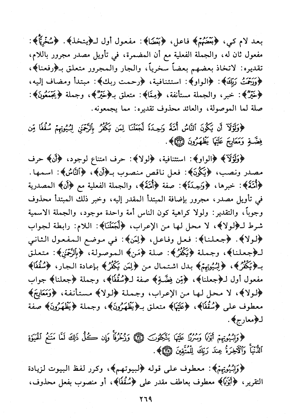 {وَلَوْلَا} {الواو}: استئنافية، {لولا}: حرف امتناع لوجود، {أَن} حرف مصدر ونصب، {يَكُونَ}: فعل ناقص منصوب بـ {أَن}، {النَّاسُ}: اسمها. {أُمَّةً}: خبرها، {وَاحِدَةً}: صفة {أُمَّةً}، والجملة الفعلية مع {أَن} المصدرية في تأويل مصدر، مجرور بإضافة المبتدأ المقدر إليه، وخبر ذلك المبتدأ محذوف وجوبًا، والتقدير: ولولا كراهية كون الناس أمة واحدة موجود، والجملة الاسمية شرط لـ {لولا}، لا محل لها من الإعراب، {لَجَعَلْنَا}: اللام: رابطة لجواب {لولا}. {جعلنا}: فعل وفاعل، {لِمَنْ}: في موضع المفعول الثاني لـ {جَعَلْنَا}، وجملة {يَكْفُرُ}: صلة {مَن} الموصولة، {بِالرَّحْمَنِ}: متعلق بـ {يَكْفُرُ}، {لِبُيُوتِهِمْ} بدل اشتمال من {لِمَنْ يَكْفُرُ} بإعادة الجار، {سُقُفًا} مفعول أول لـ {جعلنا}، {مِنْ فِضَّةٍ} صفة لـ {سُقُفًا}، وجملة {جعلنا} جواب {لولا}، لا محل لها من الإعراب، وجملة {لولا} مستأنفة، {وَمَعَارِجَ} معطوف على {سُقُفًا}، {عَلَيْهَا} متعلق بـ {يَظْهَرُونَ}، وجملة {يَظْهَرُونَ} صفة لـ {مَعَارِجَ}.