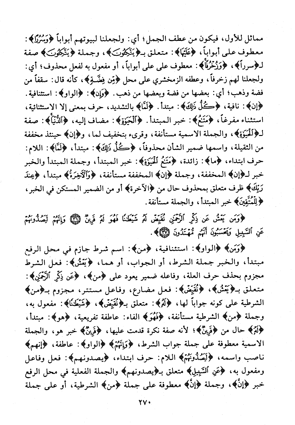 {وَمَنْ} {الواو}: استئنافية، {مَنْ}: اسم شرط جازم في محل الرفع، مبتدأ، والخبر جملة الشرط، أو الجواب، أو هما، {يَعْشُ}: فعل الشرط مجزوم بحذف حرف العلة، وفاعله ضمير يعود على {مَنْ}، {عَنْ ذِكْرِ الرَّحْمَنِ}: متعلق بـ {يَعْشُ}، {نُقَيِّضْ}: فعل مضارع، وفاعل مستتر، مجزوم بـ {من} الشرطية على كونه جوابًا لها، {لَهُ}: متعلق بـ {نُقَيِّضْ}، {شَيْطَانًا}: مفعول به، وجملة {من} الشرطية مستأنفة، {فَهُوَ} الفاء: عاطفة تفريعية، {هو}: مبتدأ، {لَهُ} حال من {قَرِينٌ}؛ لأنه صفة نكرة قدمت عليها، {قَرِينٌ} خبر هو، والجملة الاسمية معطوفة على جملة جواب الشرط، {وَإِنَّهُمْ} {الواو}: عاطفة، {إنهم} ناصب واسمه، {لَيَصُدُّونَهُمْ} اللام: حرف ابتداء، {يصدونهم}: فعل وفاعل ومفعول به، {عَنِ السَّبِيلِ} متعلق بـ {يصدونهم} والجملة الفعلية في محل الرفع خبر {إنَّ}، وجملة {إنَّ} معطوفة على جملة {من} الشرطية، أو على جملة