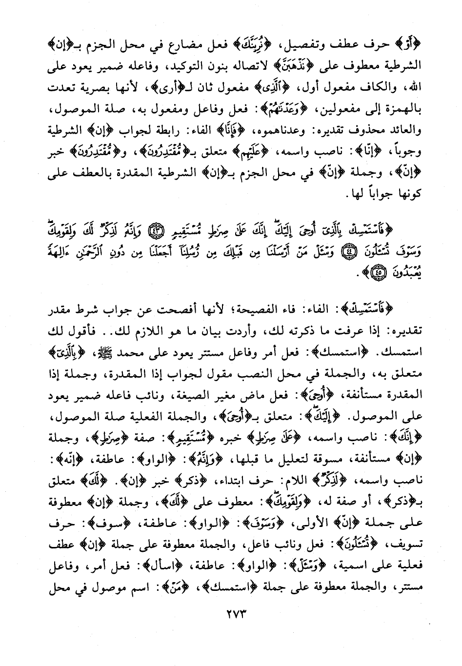 {فَاسْتَمْسِكْ}: الفاء: فاء الفصيحة؛ لأنها أفصحت عن جواب شرط مقدر تقديره: إذا عرفت ما ذكرته لك، وأردت بيان ما هو اللازم لك .. فأقول لك استمسك. {استمسك}: فعل أمر وفاعل مستتر يعود على محمد - صلى الله عليه وسلم -، {بِالَّذِي} متعلق به، والجملة في محل النصب مقول لجواب إذا المقدرة، وجملة إذا المقدرة مستأنفة، {أُوحِيَ}: فعل ماض مغير الصيغة، ونائب فاعله ضمير يعود على الموصول. {إِلَيْكَ}: متعلق بـ {أُوحِيَ}، والجملة الفعلية صلة الموصول، {إِنَّكَ}: ناصب واسمه، {عَلَى صِرَاطٍ} خبره {مُسْتَقِيمٍ}: صفة {صِرَاطٍ}، وجملة {إن} مستأنفة، مسوقة لتعليل ما قبلها، {وَإِنَّهُ}: {الواو}: عاطفة، {إِنَّهُ}: ناصب واسمه، {لَذِكْرٌ} اللام: حرف ابتداء، {ذِكْرٌ} خبر {إن}. {لَكَ} متعلق بـ {ذِكْرٌ}، أو صفة له، {وَلِقَوْمِكَ}: معطوف على {لَكَ}، وجملة {إن} معطوفة على جملة {إنّ} الأولى، {وَسَوْفَ}: {الواو}: عاطفة، {سوف}: حرف تسويف، {تُسْأَلُونَ}: فعل ونائب فاعل، والجملة معطوفة على جملة {إن} عطف فعلية على اسمية، {وَاسْأَلْ}: {الواو}: عاطفة، {اسأل}: فعل أمر، وفاعل مستتر، والجملة معطوفة على جملة {استمسك}، {مَنْ}: اسم موصول في محل