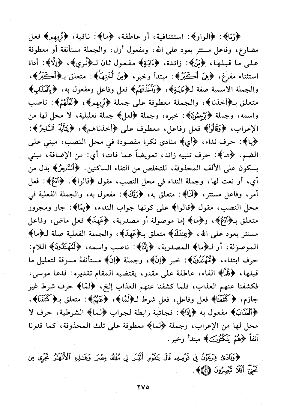 {وَمَا}: {الواو}: استئنافية، أو عاطفة، {ما}: نافية، {نُرِيهِمْ} فعل مضارع، وفاعل مستتر يعود على الله، ومفعول أول، والجملة مستأنفة أو معطوفة على ما قبلها، {مِنْ}: زائدة، {آيَةٍ} مفعول ثان لـ {نُرِي}، {إِلَّا}: أداة استثناء مفرغ، {هِيَ أَكْبَرُ}: مبتدأ وخبر، {مِنْ أُخْتِهَا}: متعلق بـ {أَكْبَرُ}، والجملة الاسمية صفة لـ {آيَةٍ}، {وَأَخَذْنَاهُمْ} فعل وفاعل ومفعول به، {بِالْعَذَابِ} متعلق بـ {أخذنا}، والجملة معطوفة على جملة {نُرِيهِمْ}، {لَعَلَّهُمْ}: ناصب واسمه، وجملة {يَرْجِعُونَ}: خبره، وجملة {لعل} جملة تعليلية، لا محل لها من الإعراب، {وَقَالُوا} فعل وفاعل، معطوف على {أخذناهم}، {يَا أَيُّهَ السَّاحِرُ}: {يَا}: حرف نداء، {أي} منادى نكرة مقصودة في محل النصب، مبني على الضم. {ها}: حرف تنبيه زائد، تعويضًا عما فات؛ أي: من الإضافة، مبني بسكون على الألف المحذوفة، للتخلص من التقاء الساكنين. {السَّاحِرُ} بدل من أي، أو نعت لها، وجملة النداء في محل النصب، مقول {قَالُوا}. {ادْعُ}: فعل أمر، وفاعل مستتر، {لَنَا}: متعلق به، {رَبَّكَ}: مفعول به، والجملة الفعلية في محل النصب، مقول {قَالُوا} على كونها جواب النداء، {بِمَا}: جار ومجرور متعلق بـ {ادْعُ}، و {ما} إما موصولة أو مصدرية، {عَهِدَ} فعل ماض، وفاعل مستتر يعود على الله، {عِنْدَكَ} متعلق بـ {عَهِدَ}، والجملة الفعلية صلة لـ {مَا} الموصولة، أو لـ {ما} المصدرية، {إِنَّنَا}: ناصب واسمه، {لَمُهْتَدُونَ} اللام: حرف ابتداء، {مُهْتَدُونَ}: خبر {إنّ}، وجملة {إنّ} مستأنفة مسوقة لتعليل ما قبلها، {فَلَمَّا} الفاء، عاطفة على مقدر، يقتضيه المقام تقديره: فدعا موسى، فكشفنا عنهم العذاب، فلما كشفنا عنهم العذاب إلخ، {لَمَّا} حرف شرط غير جازم، {كَشَفْنَا} فعل وفاعل، فعل شرط لـ {لَمَّا}، {عَنْهُمُ}: متعلق بـ {كَشَفْنَا}، {الْعَذَابَ} مفعول به {إِذَا}: فجائية رابطة لجواب {لَمَّا} الشرطية، حرف لا محل لها من الإعراب، وجملة {لَمَّا} معطوفة على تلك المحذوفة، كما قدرنا آنفًا {هُمْ يَنْكُثُونَ} مبتدأ وخبر.