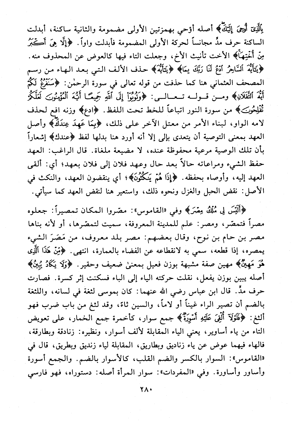 بِالَّذِي أُوحِيَ إِلَيْكَ} أصله أؤحي بهمزتين الأولى مضمومة والثانية ساكنة، أبدلت الساكنة حرف مدٍّ مجانسًا لحركة الأولى المضمومة فأبدلت واوًا. {إِلَّا هِيَ أَكْبَرُ مِنْ أُخْتِهَا} الأخت تأنيث الأخ، وجعلت التاء فيها كالعوض عن المحذوف منه. {يَا أَيُّهَ السَّاحِرُ ادْعُ لَنَا رَبَّكَ بِمَا} {يَا أَيُّهَ} حذف الألف التي بعد الهاء من رسم المصحف العثماني هنا كما حذفت من قوله تعالى في سورة الرحمن: {سَنَفْرُغُ لَكُمْ أَيُّهَ الثَّقَلَانِ} ومن قوله تعالى: {وَتُوبُوا إِلَى اللَّهِ جَمِيعًا أَيُّهَ الْمُؤْمِنُونَ لَعَلَّكُمْ تُفْلِحُونَ} من سورة النور اتباعًا للخط تحت اللفظ. {ادْعُ} وزنه أنْ لحذف لامه الواو، لبناء الأمر من معتل الآخر على ذلك، {بِمَا عَهِدَ عِنْدَكَ} وأصل العهد بمعنى التوصية أن يتعدى بإلى إلا أنه أورد هنا بدلها لفظ {عِنْدَكَ} إشعارًا بأن تلك الوصية مرعية محفوظة عنده، لا مضيعة ملغاة. قال الراغب: العهد حفظ الشيء ومراعاته حالًا بعد حال وعهد فلان إلى فلان بعهد؛ أي: ألقى العهد إليه، وأوصاه بحفظه. {إِذَا هُمْ يَنْكُثُونَ}؛ أي ينقضون العهد، والنكث في الأصل: نقض الحبل والغزل ونحوه ذلك، واستعير هنا لنقض العهد كما سيأتي.