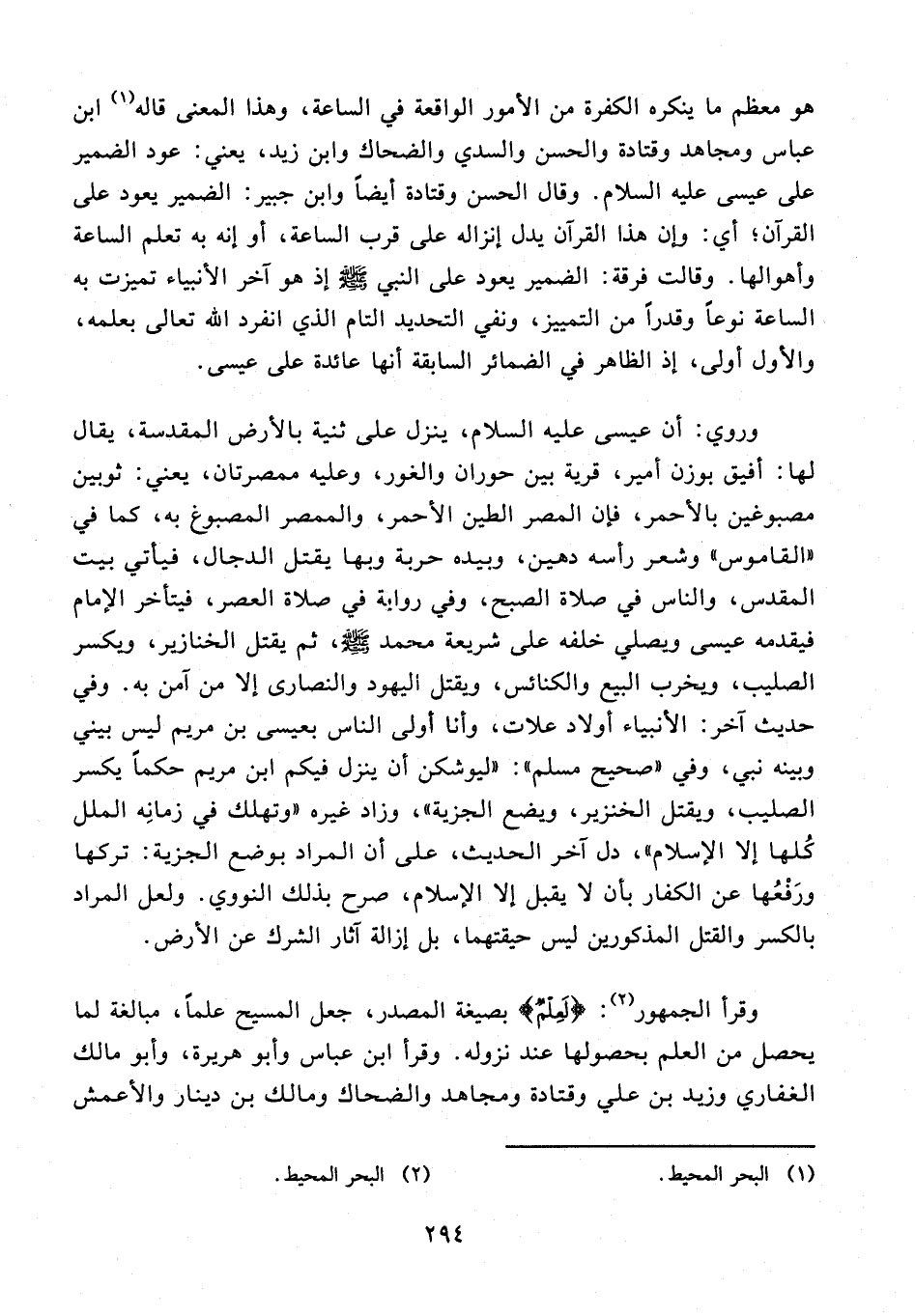 وروي: أن عيسى عليه السلام، ينزل على ثنية بالأرض المقدسة، يقال لها: أفيق بوزن أمير، قرية بين حوران والغور، وعليه ممصرتان، يعني: ثوبين مصبوغين بالأحمر، فإن العصر الطين الأحمر، والممصر المصبوغ به، كما في "القاموس" وشعر رأسه دهين، وبيده حربة وبها يقتل الدجال، فيأتي بيت المقدس، والناس في صلاة الصبح، وفي رواية في صلاة العصر، فيتأخر الإِمام فيقدمه عيسى ويصلي خلفه على شريعة محمد - صلى الله عليه وسلم -، ثم يقتل الخنازير، ويكسر الصليب، ويخرب البيع والكنائس، ويقتل اليهود والنصارى إلا من آمن به. وفي حديث آخر: الأنبياء أولاد علات، وأنا أولى الناس بعيسى بن مريم ليس بيني وبينه نبي، وفي "صحيح مسلم": "ليوشكن أن ينزل فيكم ابن مريم حكمًا يكسر الصليب، ويقتل الخنزير، ويضع الجزية"، وزاد غيره "وتهلك في زمانِه الملل كُلها إلا الإِسلام"، دل آخر الحديث، على أن المراد بوضع الجزية: تركها ورَفْعُها عن الكفار بأن لا يقبل إلا الإِسلام، صرح بذلك النووي. ولعل المراد بالكسر والقتل المذكورين ليس حيقتهما، بل إزالة آثار الشرك عن الأرض.