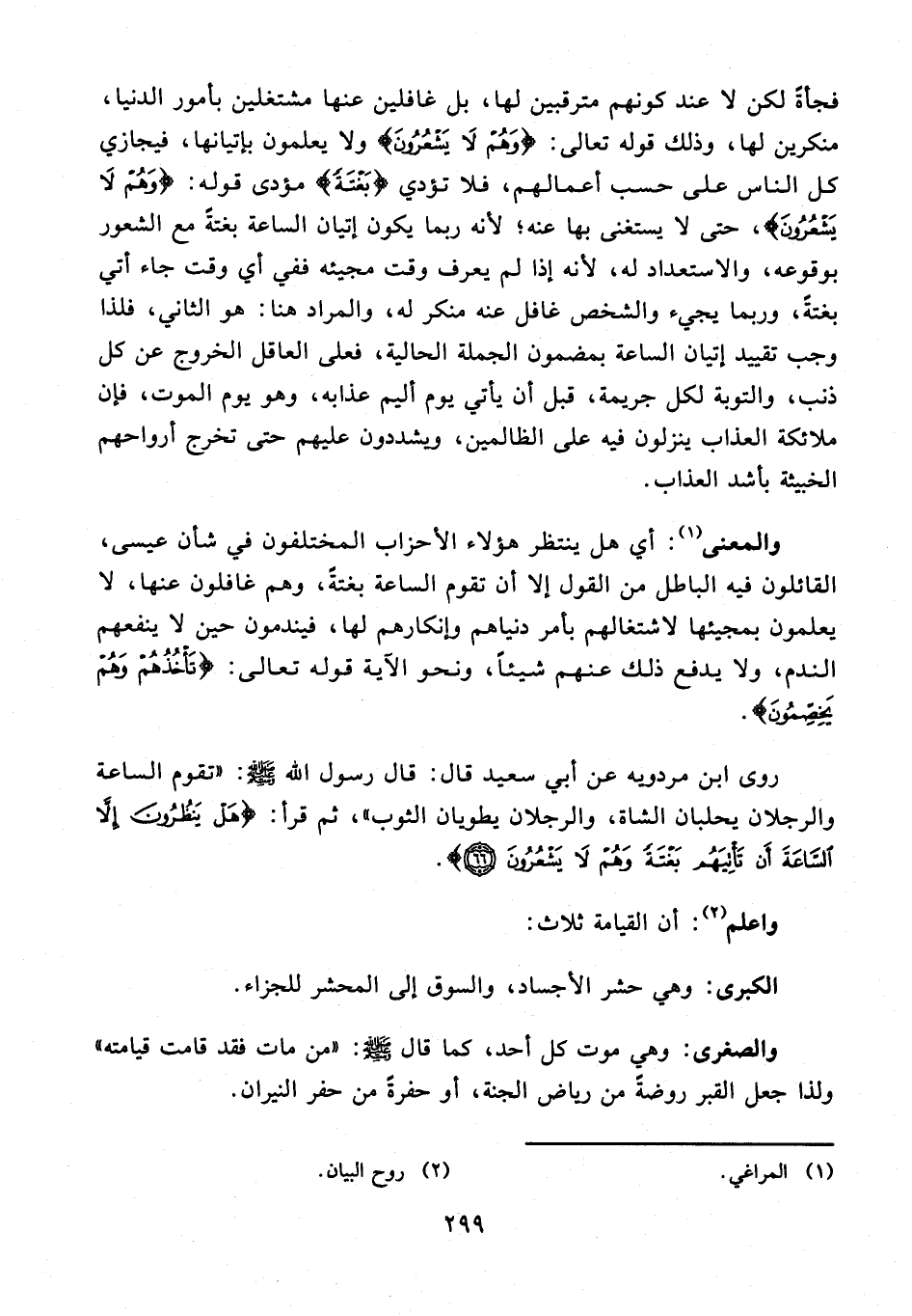 روى ابن مردويه عن أبي سعيد قال: قال رسول الله - صلى الله عليه وسلم -: "تقوم الساعة والرجلان يحلبان الشاة، والرجلان يطويان الثوب"، ثم قرأ: {هَلْ يَنْظُرُونَ إِلَّا السَّاعَةَ أَنْ تَأْتِيَهُمْ بَغْتَةً وَهُمْ لَا يَشْعُرُونَ (66)}.
