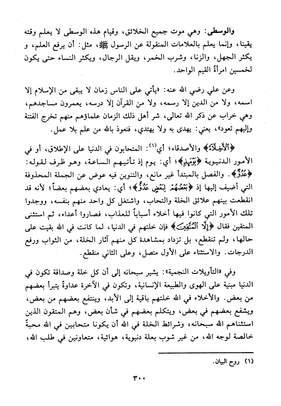 وعن علي رضي الله عنه: "يأتي على الناس زمان لا يبقى من الإِسلام إلا اسمه، ولا من الدين إلا رسمه، ولا من القرآن إلا درسه، يعمرون مساجدهم، وهي خراب عن ذكر الله تعالى، شر أهل ذلك الزمان علماؤهم منهم تخرج الفتنة وإليهم تعود"، يعني: يهدى به ولا يهتدي، فنعوذ بالله من علم بلا عمل.