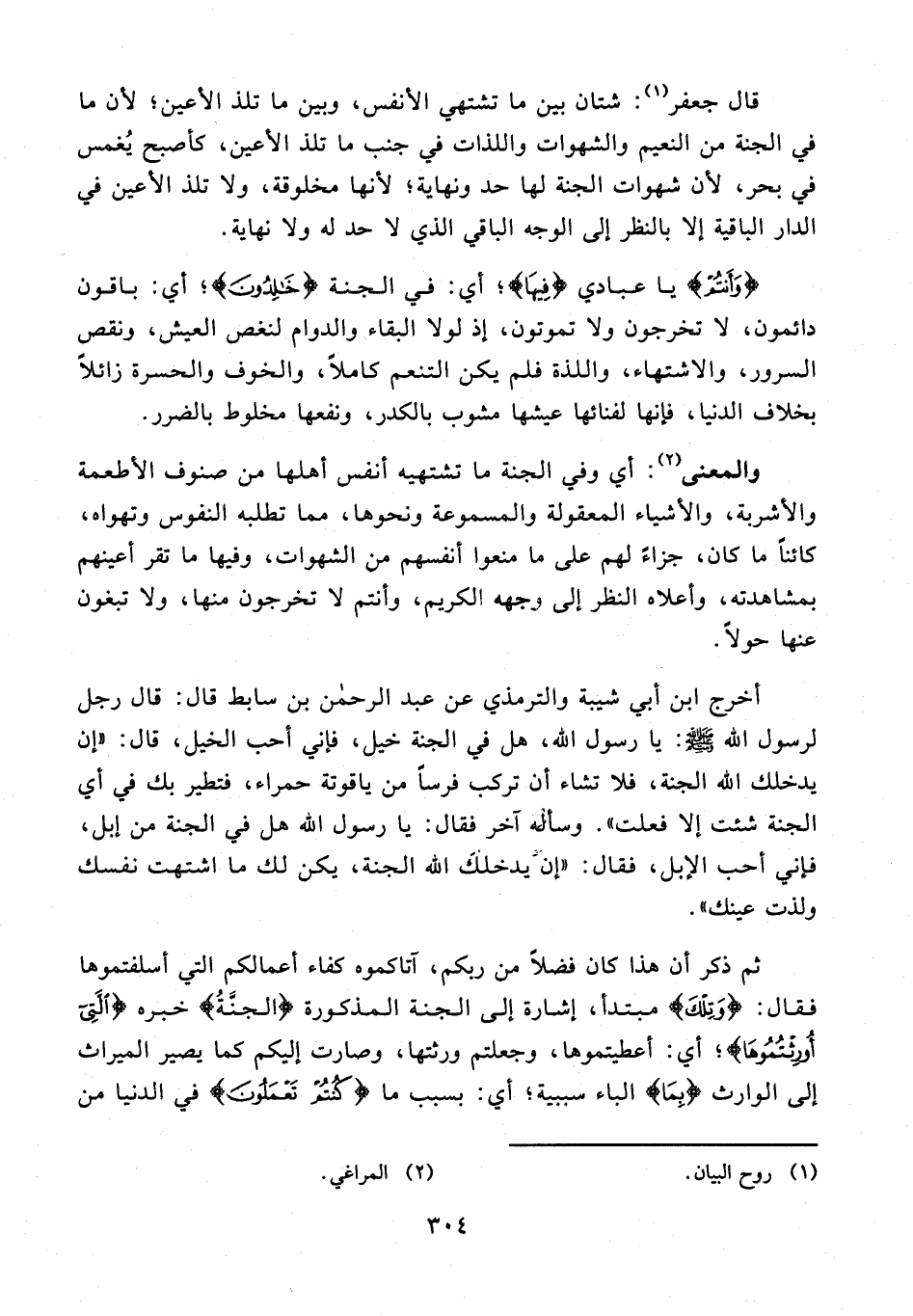 أخرج ابن أبي شيبة والترمذي عن عبد الرحمن بن سابط قال: قال رجل لرسول الله - صلى الله عليه وسلم -: يا رسول الله، هل في الجنة خيل، فإني أحب الخيل، قال: "إن يدخلك الله الجنة، فلا تشاء أن تركب فرسًا من ياقوتة حمراء، فتطير بك في أي الجنة شئت إلا فعلت". وسأله آخر فقال: يا رسول الله هل في الجنة من إبل، فإني أحب الإبل، فقال: "إن يدخلك الله الجنة، يكن لك ما اشتهت نفسك ولذت عينك".