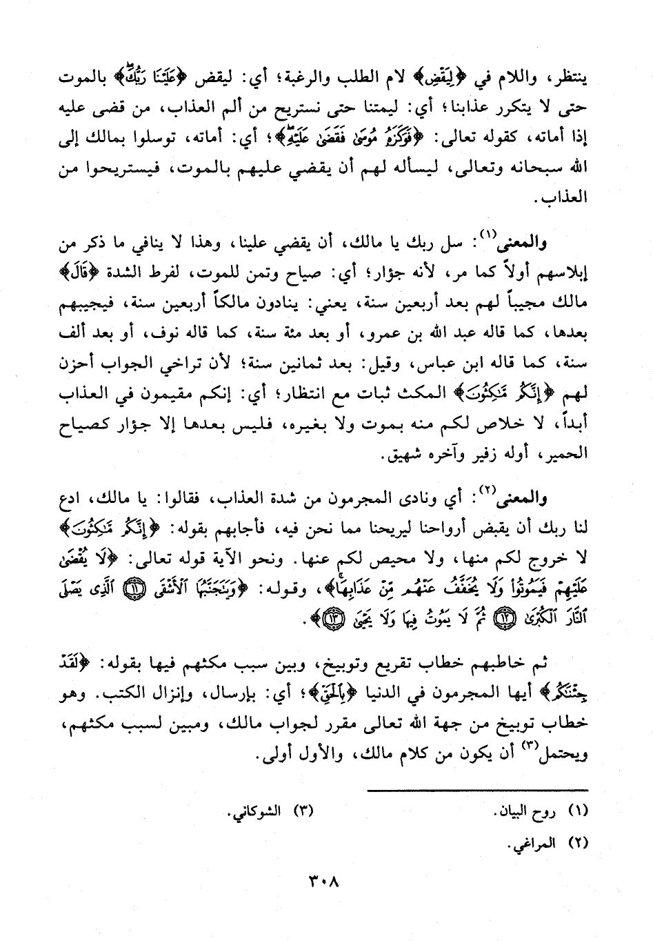 والمعنى (¬2): أي ونادى المجرمون من شدة العذاب، فقالوا: يا مالك، ادع لنا ربك أن يقبض أرواحنا ليريحنا مما نحن فيه، فأجابهم بقوله: {إِنَّكُمْ مَاكِثُونَ} لا خروج لكم منها, ولا محيص لكم عنها. ونحو الآية قوله تعالى: {لَا يُقْضَى عَلَيْهِمْ فَيَمُوتُوا وَلَا يُخَفَّفُ عَنْهُمْ مِنْ عَذَابِهَا}، وقوله: {وَيَتَجَنَّبُهَا الْأَشْقَى (11) الَّذِي يَصْلَى النَّارَ الْكُبْرَى (12) ثُمَّ لَا يَمُوتُ فِيهَا وَلَا يَحْيَى (13)}.