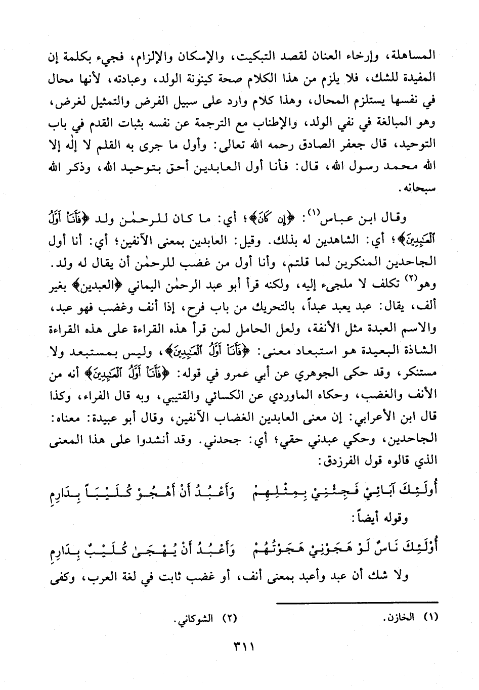 وقال ابن عباس (¬1): {إِنْ كَانَ}؛ أي: ما كان للرحمن ولد {فَأَنَا أَوَّلُ الْعَابِدِينَ}؛ أي: الشاهدين له بذلك. وقيل: العابدين بمعنى الآنفين؛ أي: أنا أول الجاحدين المنكرين لما قلتم، وأنا أول من غضب للرحمن أن يقال له ولد. وهو (¬2) تكلف لا ملجىء إليه، ولكنه قرأ أبو عبد الرحمن اليماني {العبدين} بغير ألف، يقال: عبد يعبد عبدًا، بالتحريك من باب فرح، إذا أنف وغضب فهو عبد، والاسم العبدة مثل الأنفة، ولعل الحامل لمن قرأ هذه القراءة على هذه القراءة الشاذة البعيدة هو استبعاد معنى: {فَأَنَا أَوَّلُ الْعَابِدِينَ}، وليس بمستبعد ولا مستنكر، وقد حكى الجوهري عن أبي عمرو في قوله: {فَأَنَا أَوَّلُ الْعَابِدِينَ} أنه من الأنف والغضب، وحكاه الماوردي عن الكسائي والقتيبي، وبه قال الفراء، وكذا قال ابن الأعرابي: إن معنى العابدين الغضاب الآنفين، وقال أبو عبيدة: معناه: الجاحدين، وحكي عبدني حقي؛ أي: جحدني. وقد أنشدوا على هذا المعنى الذي قالوه قول الفرزدق: