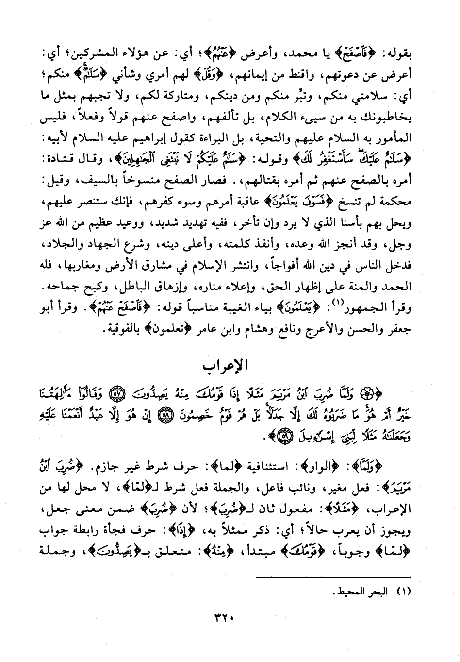 {وَلَمَّا}: {الواو}: استئنافية {لما}: حرف شرط غير جازم. {ضُرِبَ ابْنُ مَرْيَمَ}: فعل مغير، ونائب فاعل، والجملة فعل شرط لـ {لمّا}، لا محل لها من الإعراب، {مَثَلًا}: مفعول ثان لـ {ضُرِبَ}؛ لأن {ضُرِبَ} ضمن معنى جعل، ويجوز أن يعرب حالًا؛ أي: ذكر ممثلًا به، {إذَا}: حرف فجأة رابطة جواب {لمّا} وجوبًا، {قَوْمُكَ} مبتدأ، {مِنْهُ}: متعلق بـ {يَصِدُّونَ}، وجملة