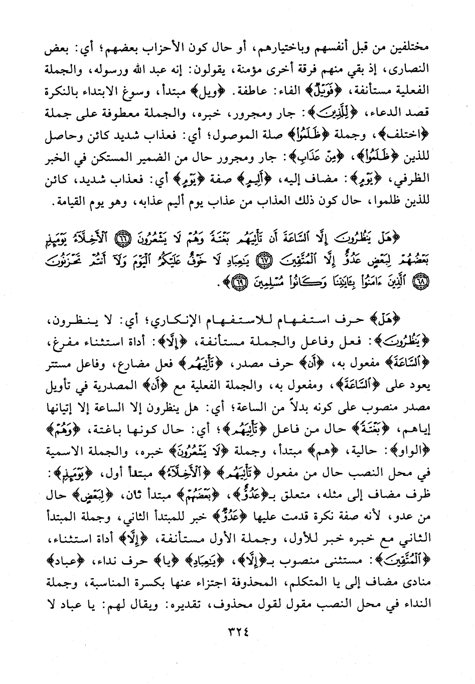 {هَلْ} حرف استفهام للاستفهام الإنكاري؛ أي: لا ينظرون، {يَنْظُرُونَ}: فعل وفاعل والجملة مستأنفة، {إِلَّا}: أداة استثناء مفرغ، {السَّاعَةَ} مفعول به، {أَن} حرف مصدر، {تَأْتِيَهُمْ} فعل مضارع، وفاعل مستتر يعود على {السَّاعَةَ}، ومفعول به، والجملة الفعلية مع {أَن} المصدرية في تأويل مصدر منصوب على كونه بدلًا من الساعة؛ أي: هل ينظرون إلا الساعة إلا إتيانها إياهم، {بَغْتَةً} حال من فاعل {تَأْتِيَهُمْ}؛ أي: حال كونها باغتة، {وَهُمْ} {الواو}: حالية، {هم} مبتدأ، وجملة {لَا يَشْعُرُونَ} خبره، والجملة الاسمية في محل النصب حال من مفعول {تَأْتِيَهُمْ} {الْأَخِلَّاءُ} مبتدأ أول، {يَوْمَئِذٍ}: ظرف مضاف إلى مثله، متعلق بـ {عَدُوٌّ}، {بَعْضُهُمْ} مبتدأ ثان، {لِبَعْضٍ} حال من عدو؛ لأنه صفة نكرة قدمت عليها {عَدُوٌّ} خبر للمبتدأ الثاني، وجملة المبتدأ الثاني مع خبره خبر للأول، وجملة الأول مستأنفة، {إِلَّا} أداة استثناء، {الْمُتَّقِينَ}: مستثنى منصوب بـ {إِلَّا}، {يَا عِبَادِ} {يا} حرف نداء، {عباد} منادى مضاف إلى يا المتكلم، المحذوفة اجتزاء عنها بكسرة المناسبة، وجملة النداء في محل النصب مقول لقول محذوف، تقديره: ويقال لهم: يا عباد لا