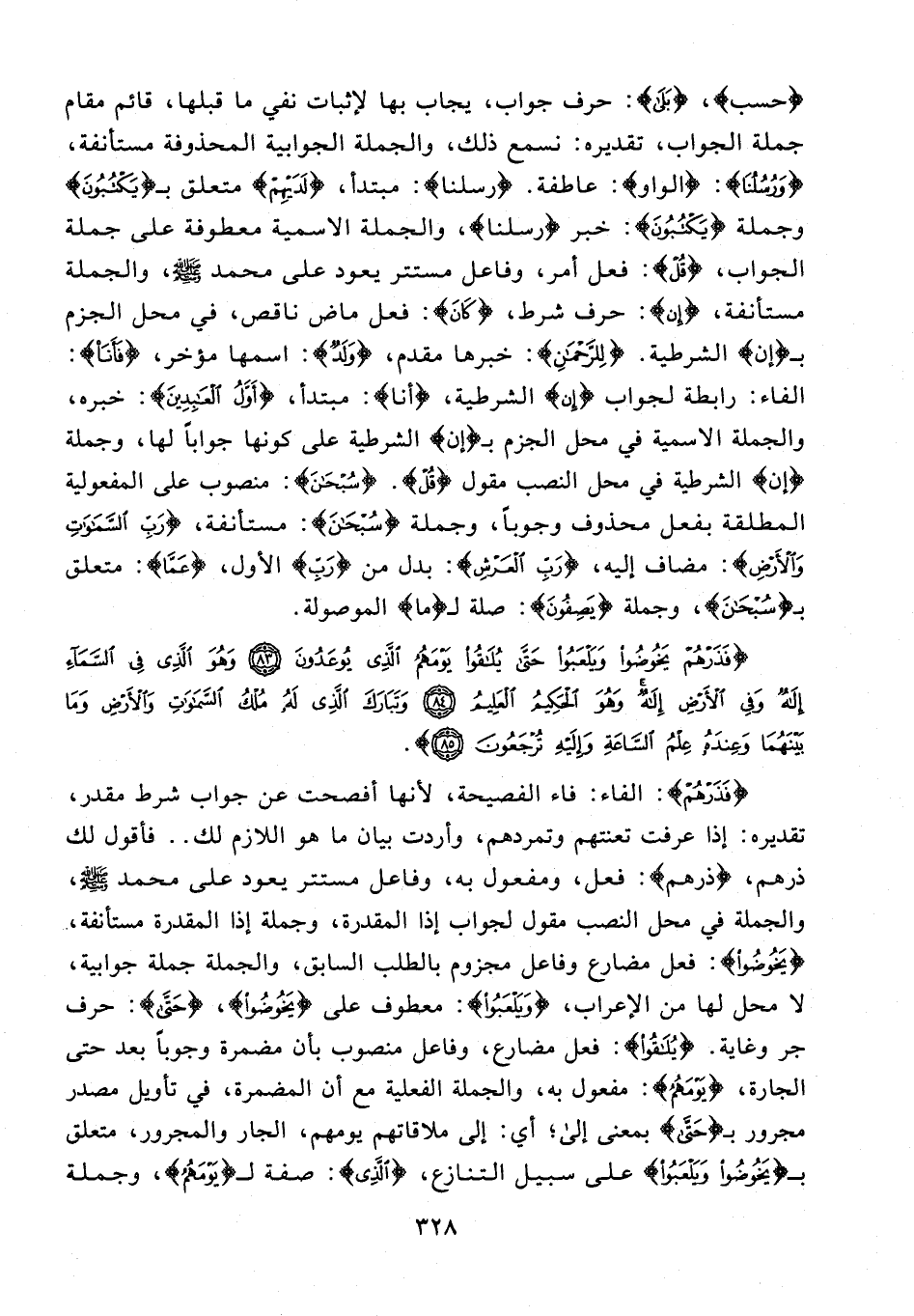 {فَذَرْهُمْ}: الفاء: فاء الفصيحة، لأنها أفصحت عن جواب شرط مقدر، تقديره: إذا عرفت تعنتهم وتمردهم، وأردت بيان ما هو اللازم لك .. فأقول لك ذرهم، {ذرهم}: فعل، ومفعول به، وفاعل مستتر يعود على محمد - صلى الله عليه وسلم -، والجملة في محل النصب مقول لجواب إذا المقدرة، وجملة إذا المقدرة مستأنفة {يَخُوضُوا}: فعل مضارع وفاعل مجزوم بالطلب السابق، والجملة جملة جوابية، لا محل لها من الإعراب، {وَيَلْعَبُوا}: معطوف على {يَخُوضُوا}، {حَتَّى}: حرف جر وغاية. {يُلَاقُوا}: فعل مضارع، وفاعل منصوب بأن مضمرة وجوبًا بعد حتى الجارة، {يَوْمَهُمُ}: مفعول به، والجملة الفعلية مع أن المضمرة، في تأويل مصدر مجرور بـ {حَتَّى} بمعنى إلى؛ أي: إلى ملاقاتهم يومهم، الجار والمجرور، متعلق بـ {يَخُوضُوا وَيَلْعَبُوا} على سبيل التنازع، {الَّذِي}: صفة لـ {يَوْمَهُمُ}، وجملة