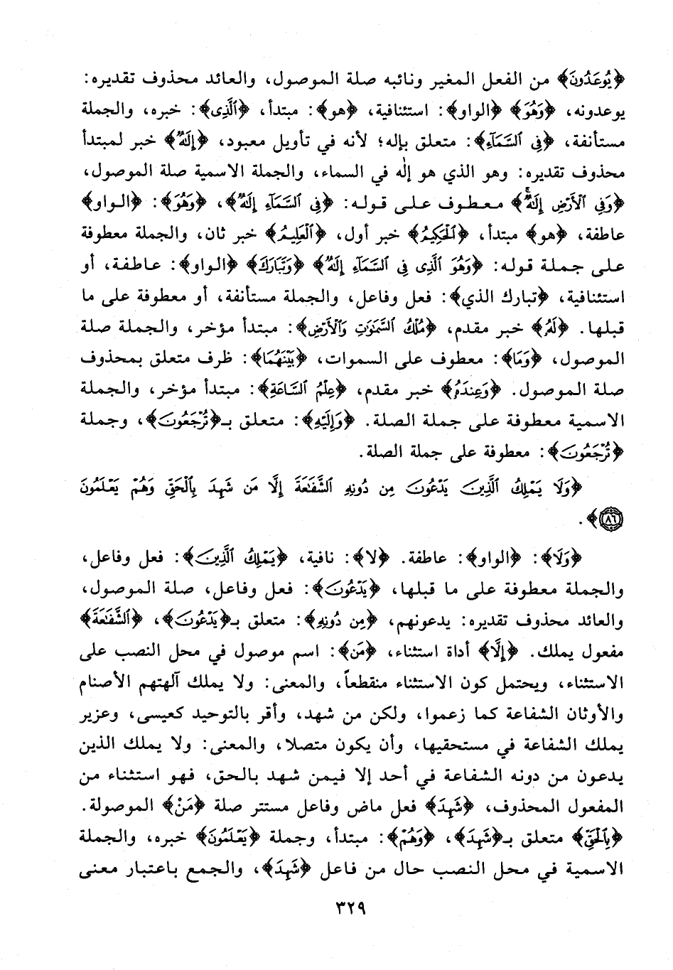 {وَلَا}: {الواو}: عاطفة. {لا}: نافية، {يَمْلِكُ الَّذِينَ}: فعل وفاعل، والجملة معطوفة على ما قبلها، {يَدْعُونَ}: فعل وفاعل، صلة الموصول، والعائد محذوف تقديره: يدعونهم، {مِنْ دُونِهِ}: متعلق بـ {يَدْعُونَ}، {الشَّفَاعَةَ} مفعول يملك. {إِلَّا} أداة استثناء، {مَن}: اسم موصول في محل النصب على الاستثناء، ويحتمل كون الاستثناء منقطعًا، والمعنى: ولا يملك آلهتهم الأصنام والأوثان الشفاعة كما زعموا، ولكن من شهد، وأقر بالتوحيد كعيسى، وعزير يملك الشفاعة في مستحقيها، وأن يكون متصلا، والمعنى: ولا يملك الذين يدعون من دونه الشفاعة في أحد إلا فيمن شهد بالحق، فهو استثناء من المفعول المحذوف، {شَهِدَ} فعل ماض وفاعل مستتر صلة {مَنْ} الموصولة. {بِالْحَقِّ} متعلق بـ {شَهِدَ}، {وَهُمْ}: مبتدأ، وجملة {يَعْلَمُونَ} خبره، والجملة الاسمية في محل النصب حال من فاعل {شَهِدَ}، والجمع باعتبار معنى