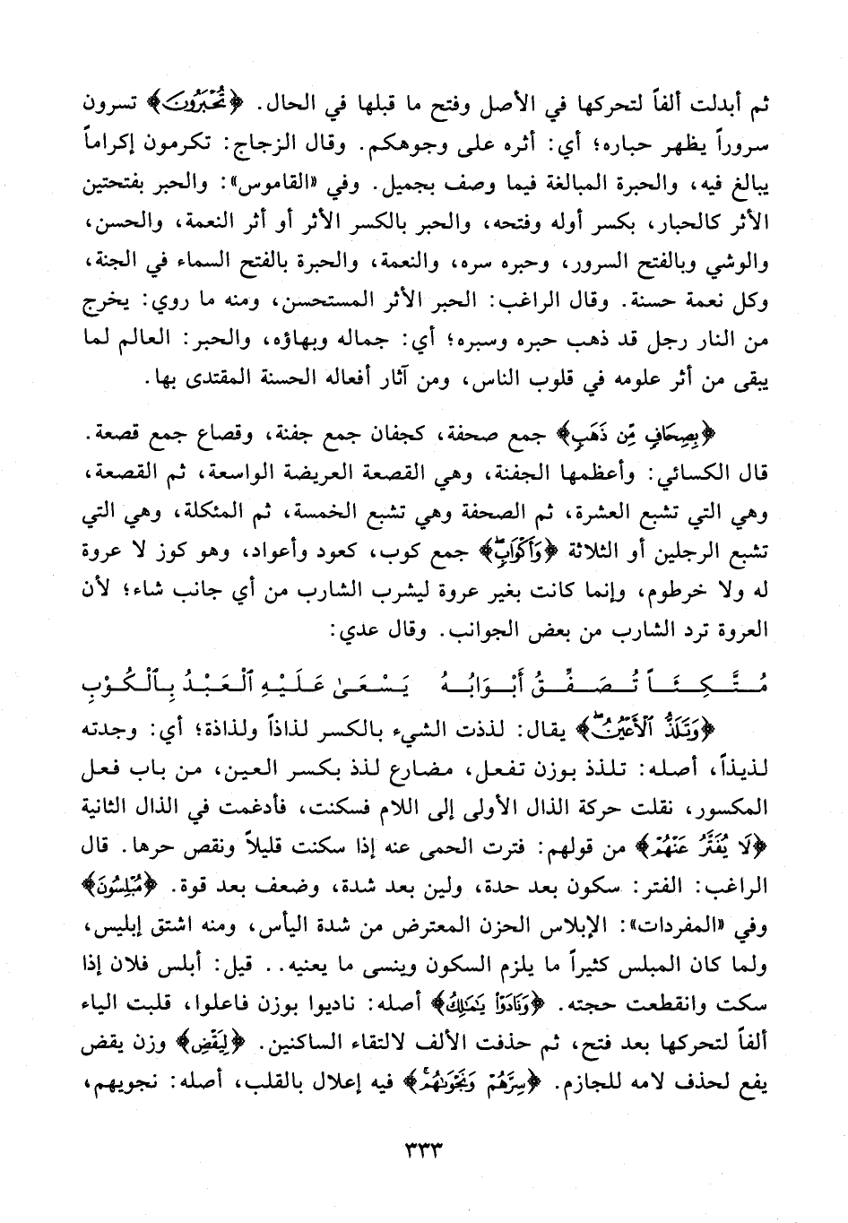 {وَتَلَذُّ الْأَعْيُنُ} يقال: لذذت الشيء بالكسر لذاذًا ولذاذة؛ أي: وجدته لذيذًا، أصله: تلذذ بوزن تفعل، مضارع لذذ بكسر العين، من باب فعل المكسور، نقلت حركة الذال الأولى إلى اللام فسكنت، فأدغمت في الذال الثانية {لَا يُفَتَّرُ عَنْهُمْ} من قولهم: فترت الحمى عنه إذا سكنت قليلًا ونقص حرها. قال الراغب: الفتر: سكون بعد حدة، ولين بعد شدة، وضعف بعد قوة. {مُبْلِسُونَ} وفي "المفردات": الإبلاس الحزن المعترض من شدة اليأس، ومنه اشتق إبليس، ولما كان المبلس كثيرًا ما يلزم السكون وينسى ما يعنيه .. قيل: أبلس فلان إذا سكت وانقطعت حجته. {وَنَادَوْا يَا مَالِكُ} أصله: ناديوا بوزن فاعلوا، قلبته الياء ألفًا لتحركها بعد فتح، ثم حذفت الألف لالتقاء الساكنين. {لِيَقْضِ} وزن يقض يفع لحذف لامه للجازم. {سِرَّهُمْ وَنَجْوَاهُمْ} فيه إعلال بالقلب، أصله: نجويهم